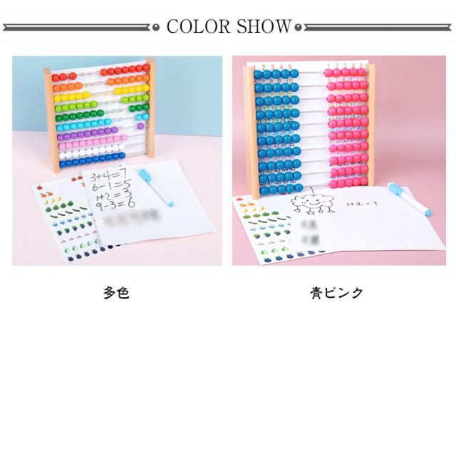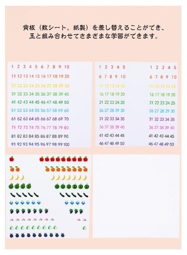 | 遊びながら学べる100玉そろばん!カードとペンをプレゼント! 数の数え方や簡単な計算を視覚的に分かりやすいです。 いろいろな数と果物の勉強ができるシートが付いています。 背板(数シート。紙製)を差し替えることができ、玉と組み合わせてさまざまな学習ができます。 玉をスライドさせることで、指先の器用さや数の理解を深めることができます。 | |