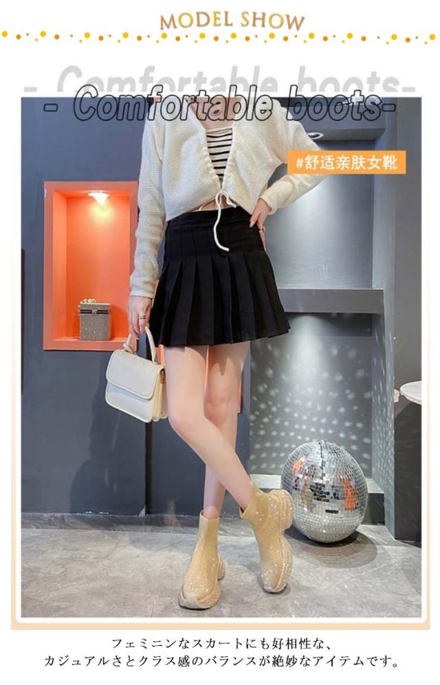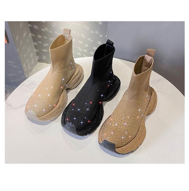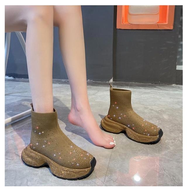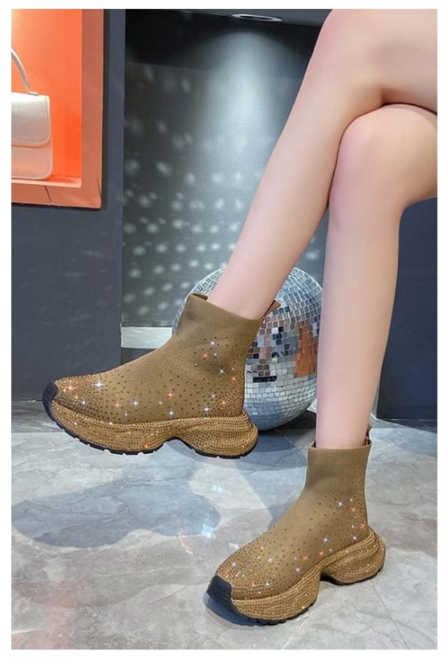 キラキラ ラインストーン キラキラ レディース プラットフォーム ブーツ 靴 厚底 ショートブーツ 軽量 スニーカーソール ハイカット ショート丈 スポーティ ストレッチ 歩きやすい 痛くない ベージュ ブラウン