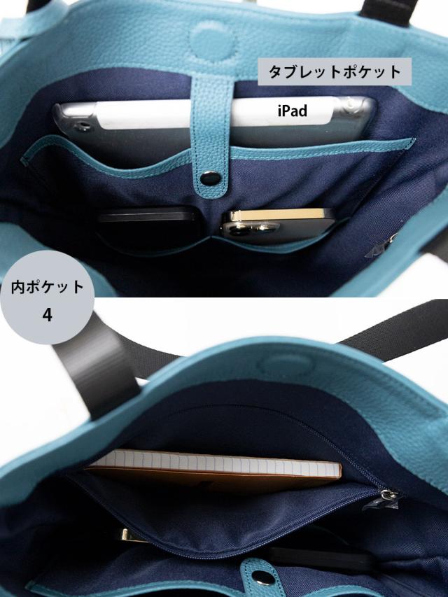 タブレットポケットはiPad対応サイズ。その他3つのポケットがあり小物をきっちり収納できます。背面のポケットはスマホサイズですっぽり収まります。