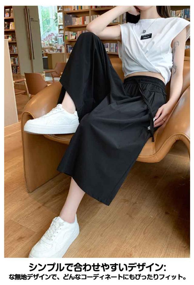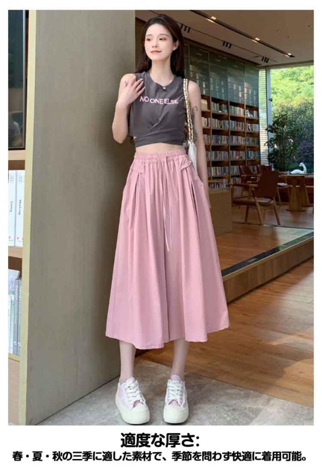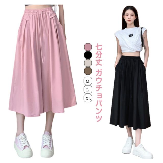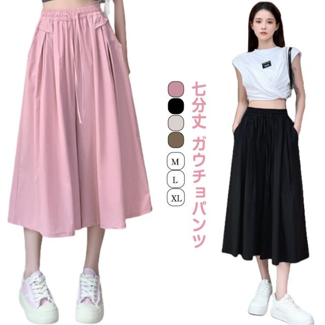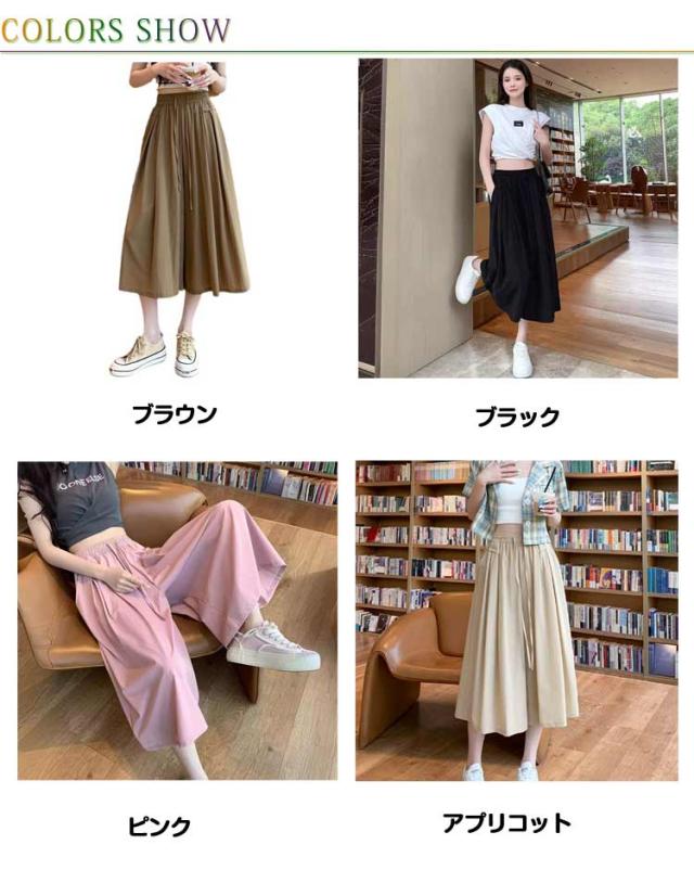 キュロット パンツ 無地 レディース 七分丈 ウエストゴム ガウチョパンツ 薄手 アイスシルク ワイドパンツ フレアパンツ 涼しい きれいめ 脚長効果 体型カバー カーキ ピンク ブラウン