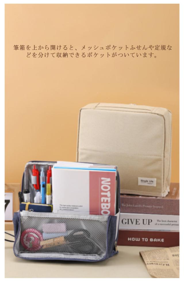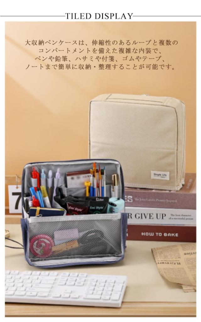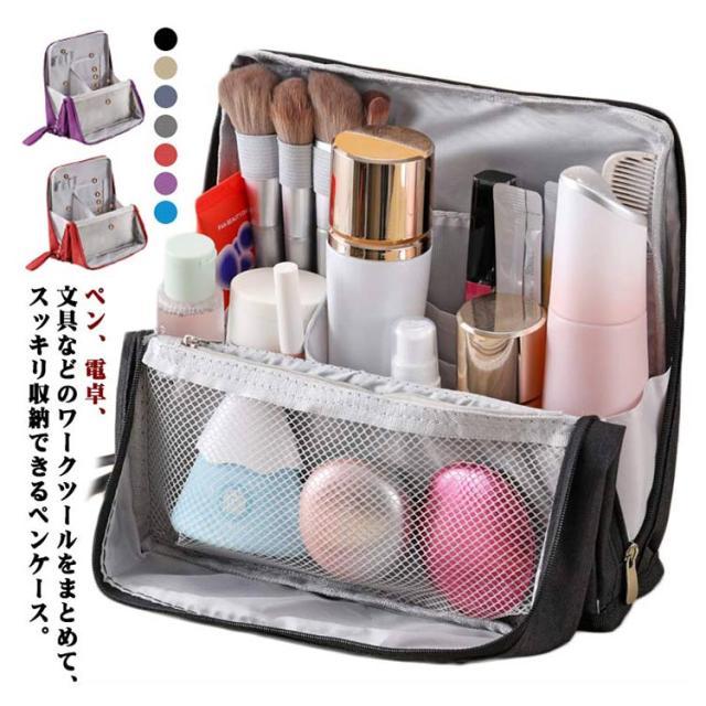 | ペン、電卓、文具などのワークツールをまとめて、スッキリ収納できるペンケース。 大収納ペンケースは、伸縮性のあるループと複数のコンパートメントを備えた複雑な内装で、ペンや鉛筆、ハサミや付箋、ゴムやテープ、ノートまで簡単に収納・整理することが可能です。 ペン類を立てて収納できるから、一目瞭然で、デスク周りがスッキリ。 ぺんホルダーがあるので、普段よく使うペンと、その他のカラーペンなどを分けて収納できます。 筆箱を上から開けると、メッシュポケットふせんや定規などを分けて収納できるポケットがついています。 また、折りたたみ部分にスマホホルダーとしても活躍できそうです。 メイクブラシなどメイクツールや化粧品をたっぷり収納できるから化粧ポーチとしても大人気です。 持ち手があるので持ち運びに便利です。 | |