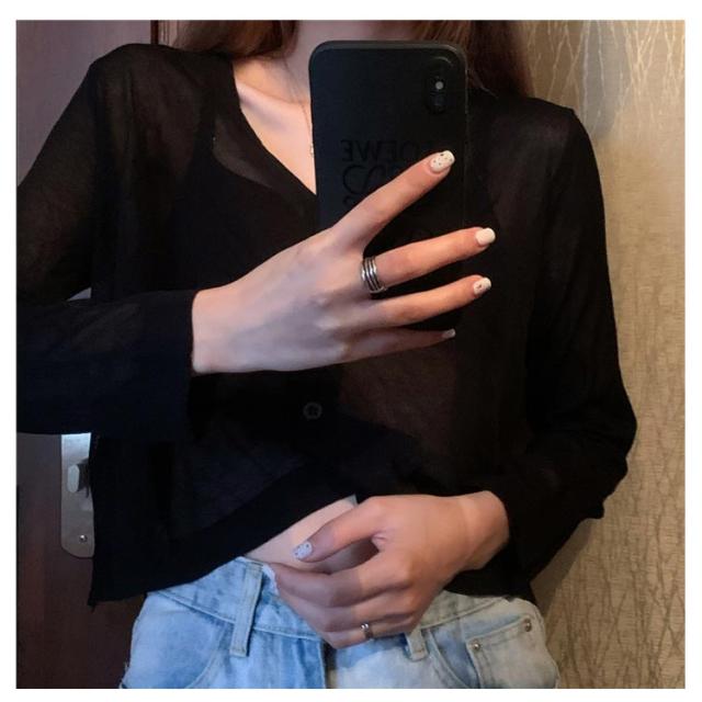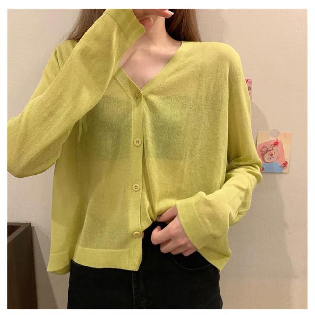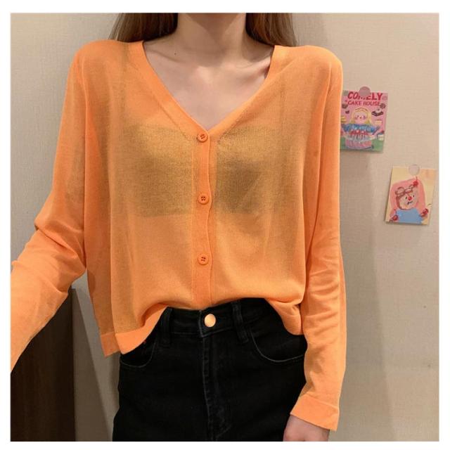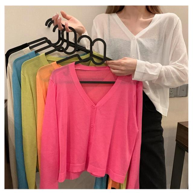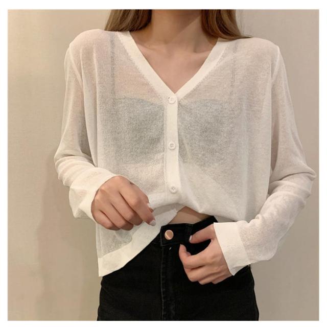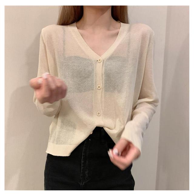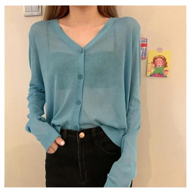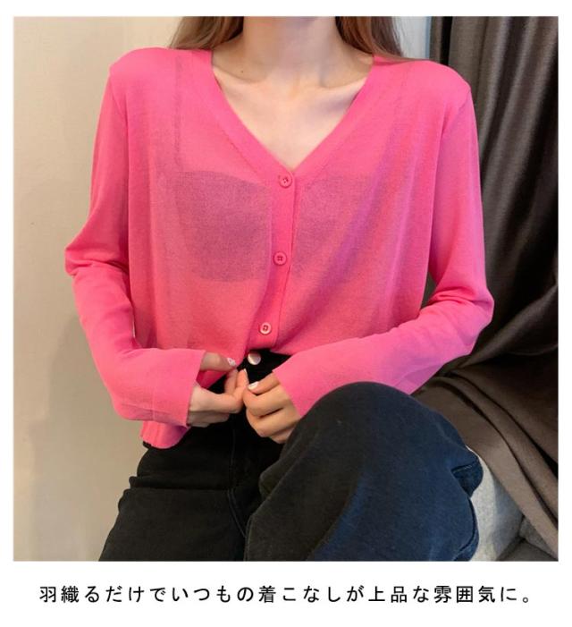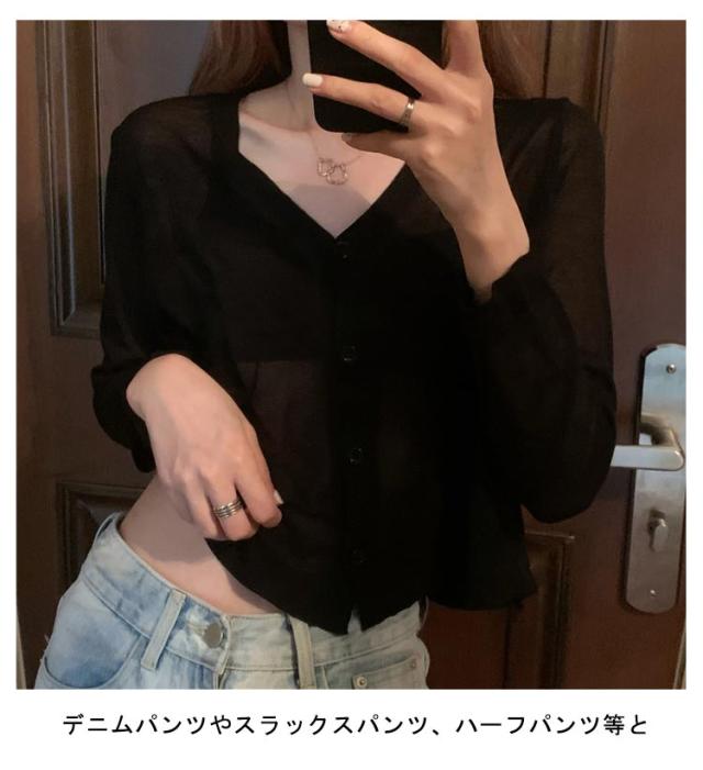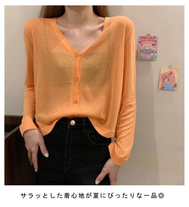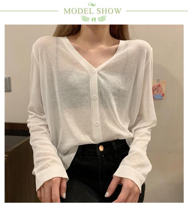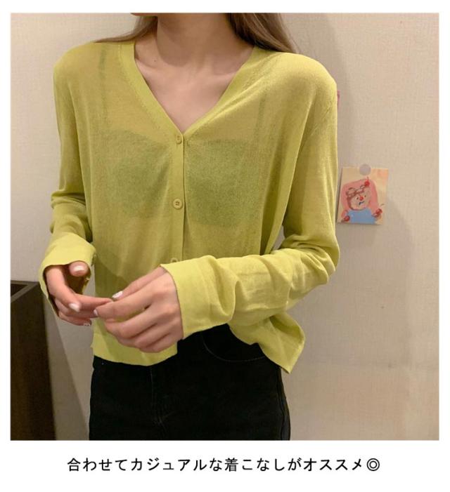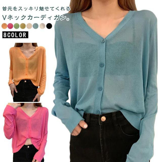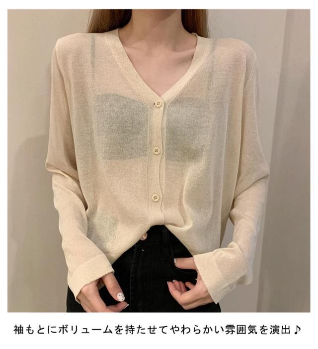 透け感 薄手 ニット シアー オフィス セーター サマーニット レディース トップス Vネック おしゃれ 長袖 カジュアル 無地 大人 上品 カーディガン 春 夏 韓国 韓国ファッション 10代 20代 30代 40代
