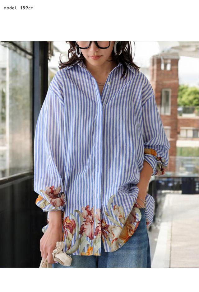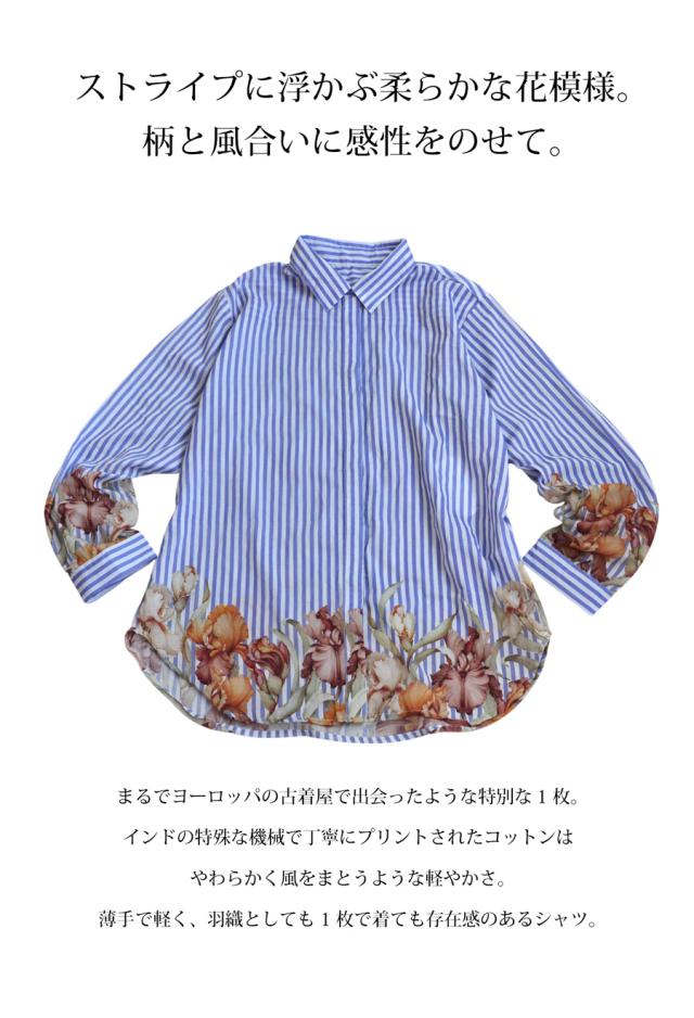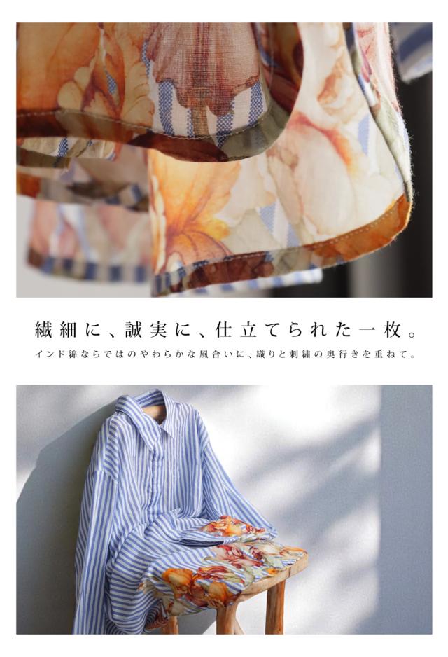 iya-00100 シャツ ブラウス 長袖 花柄 ストライプ インド綿 コットン 綿100 綿 薄手 羽織り 春 夏 秋 ナチュラル シンプル 上品 きれいめ ナチュラル シック