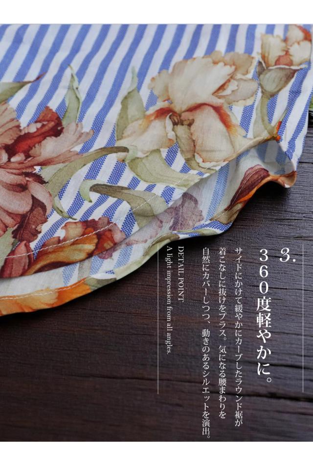 裾はラウンドカットでサイドにかけて緩やかにカーブを描き、腰まわりを自然にカバーしながら、