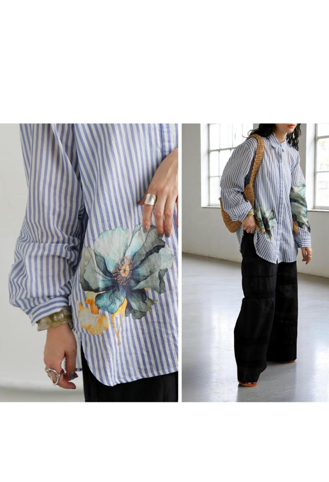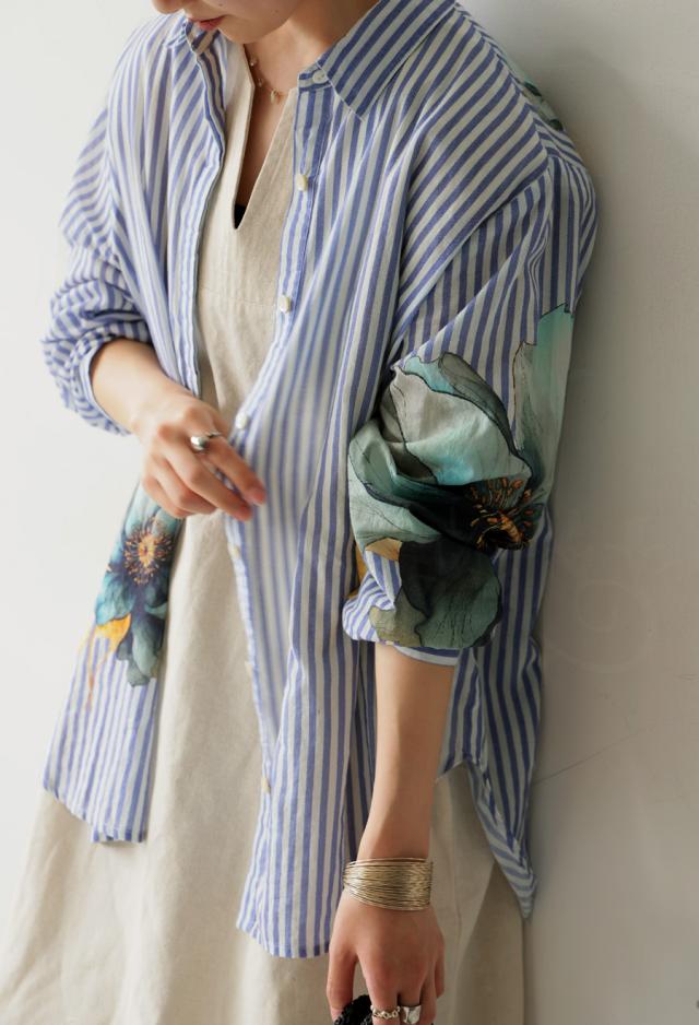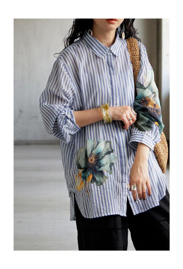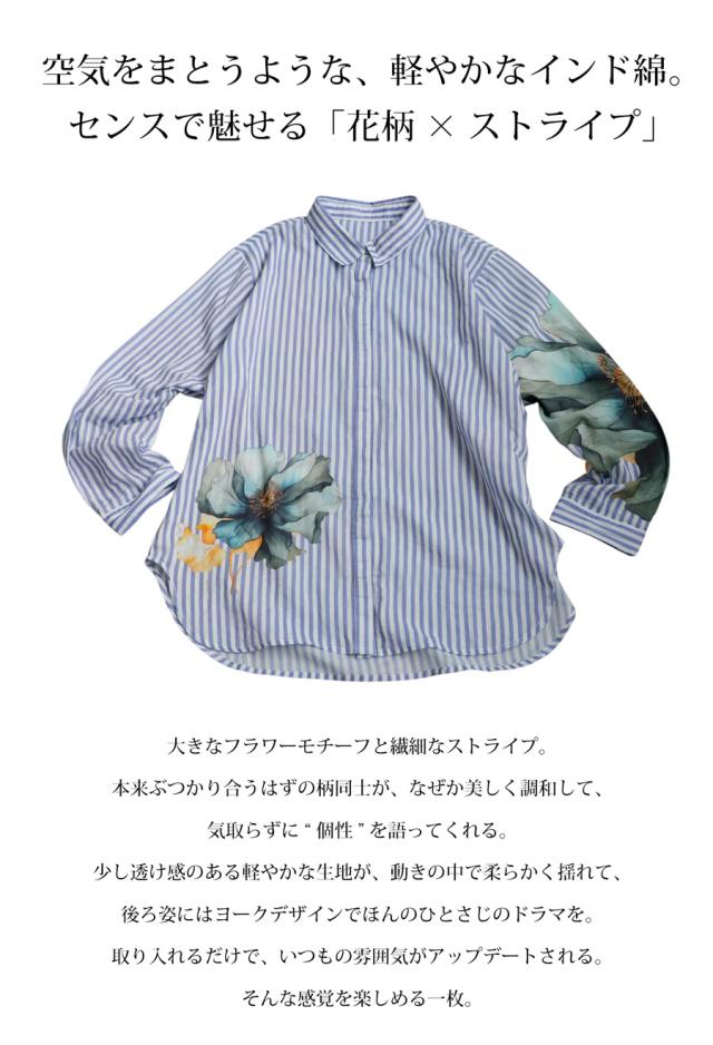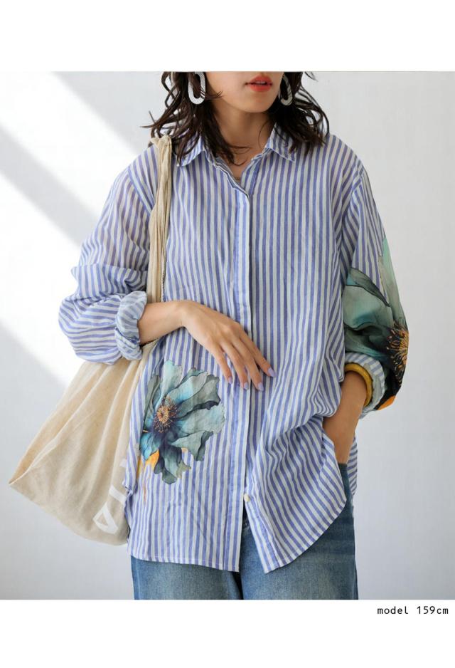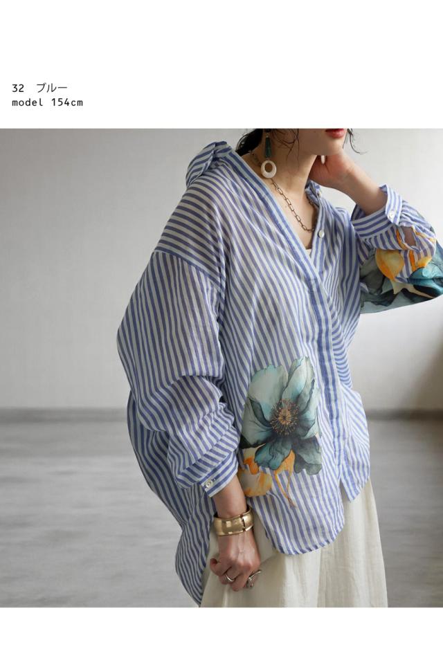 iya-00102 シャツ フラワープリント ストライプ柄 ロング丈 涼感素材 透け感 ナチュラル デザインシャツ 春夏コーデ 重ね着 モード 体型カバー ゆったり 羽織り 前開き
