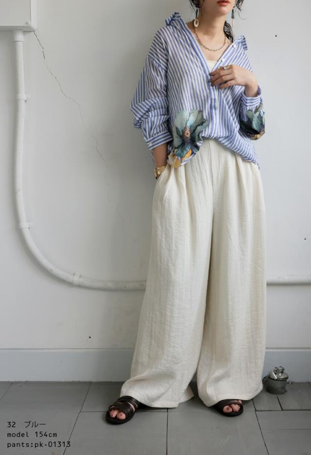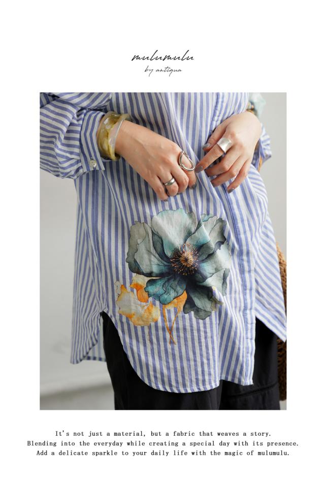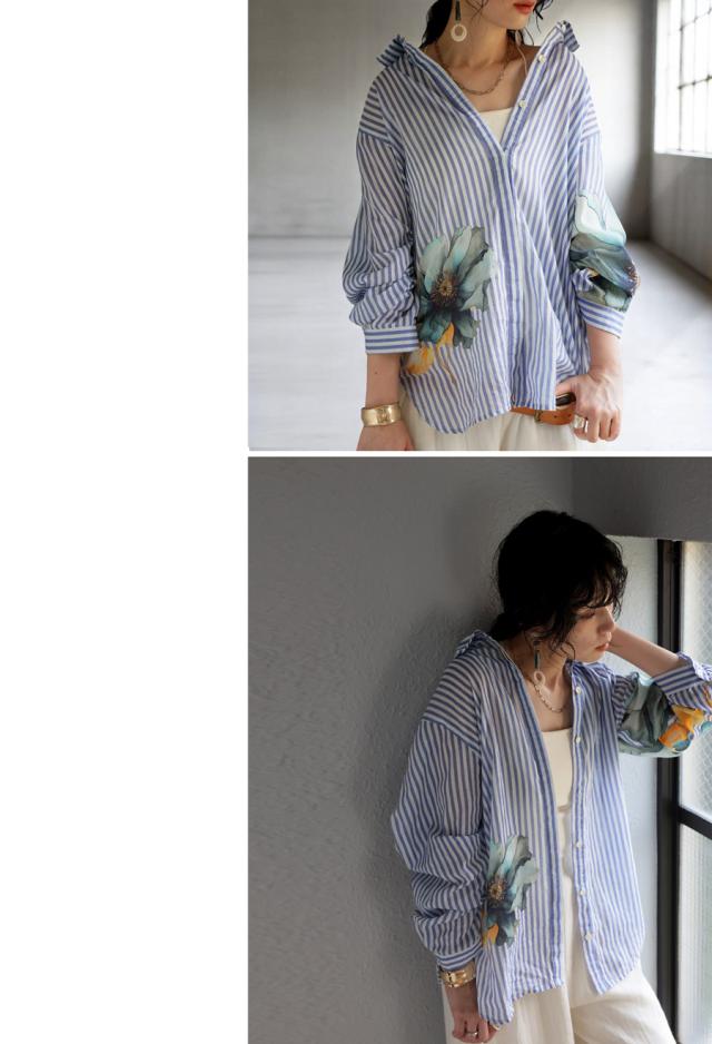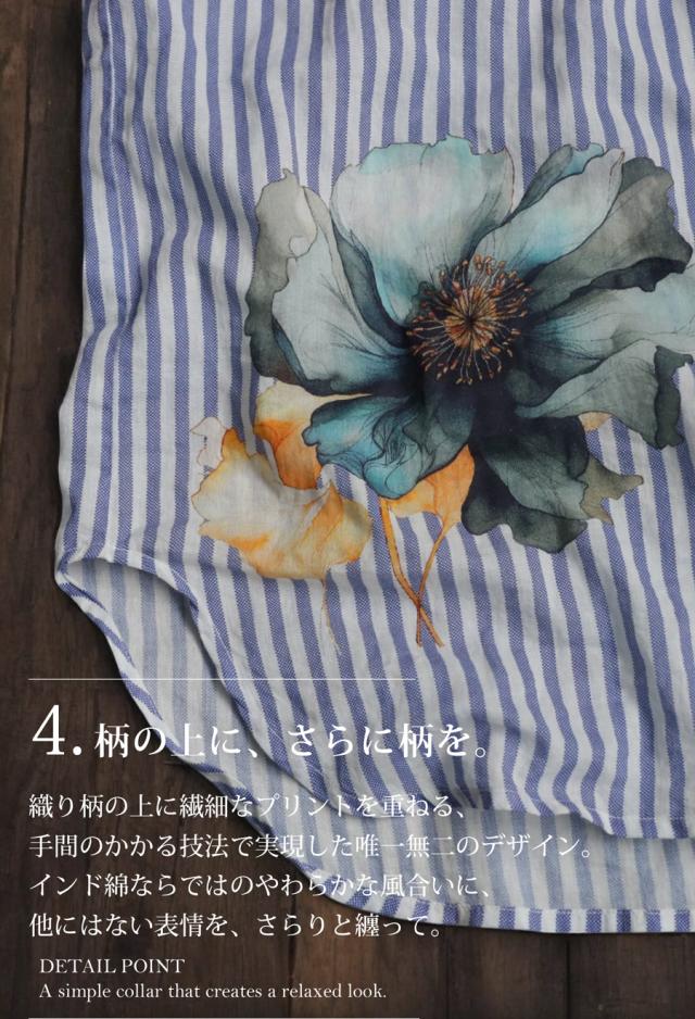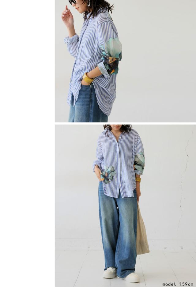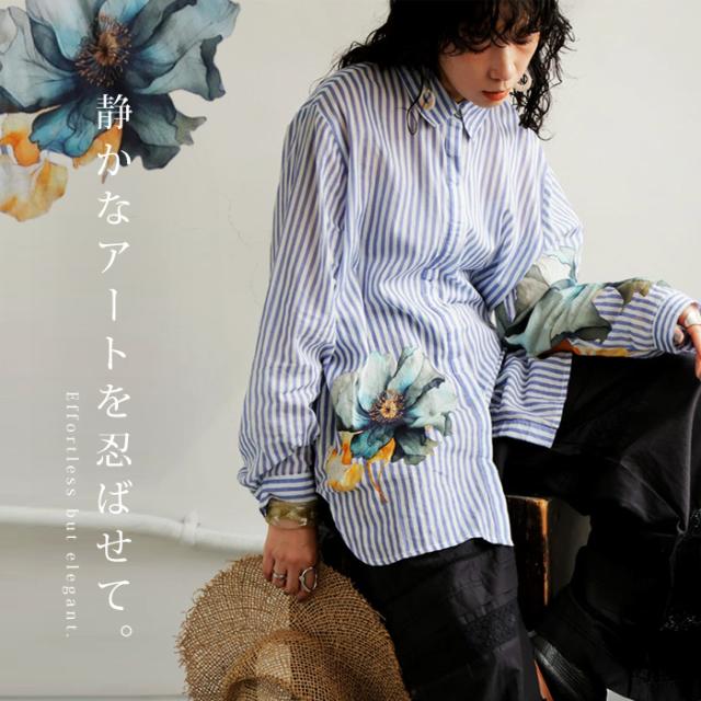 iya-00102 シャツ フラワープリント ストライプ柄 ロング丈 涼感素材 透け感 ナチュラル デザインシャツ 春夏コーデ 重ね着 モード 体型カバー ゆったり 羽織り 前開き