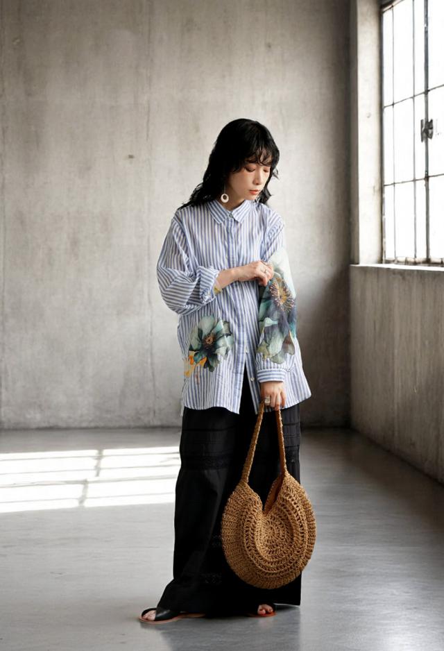 織り柄の上に大胆に描かれた花模様が、印象的なアクセントになりながらも不思議と調和し、洗練された個性を放ちます。