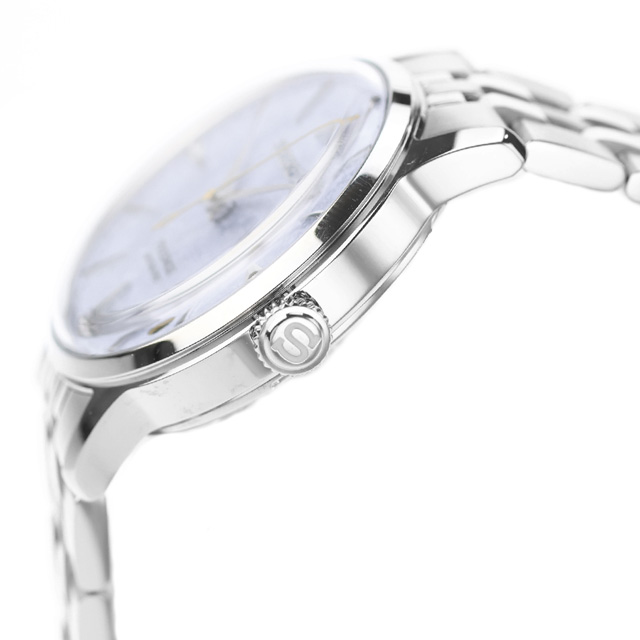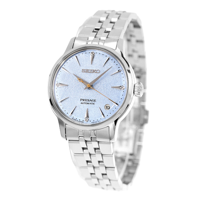 正規品 7年保証キャンペーン 送料無料 セイコー プレザージュ ダイヤモンド 日本製 レディース 腕時計 SRRY049 SEIKO PRESAGE Cocktail Time アナログ ライトブルー ◆夏のフローズンカクテルをイメージしたモデルが登場。夏らしいフローズンカクテルを意識したクラッシュした氷の表情を思わせる、オリジナリティある型打ちと、さわやかなダイヤルの色味が特徴です。ダイヤをセッティングする4か所の角台座とV字形状略字を今回新しく考案。カクテルタイムのアイコンであるくさび形状の略字はキープしています。ブレスレット形状は、コマのバランスを見直し、テーパーをかけ、より軽やかにアップデートしました。ケースの厚みを軽減するため、通常のスクリュー金属裏ぶたを採用しています。誕生日や記念日のプレゼントにもおすすめです。 発売日:2025年6月発売 機械式腕時計