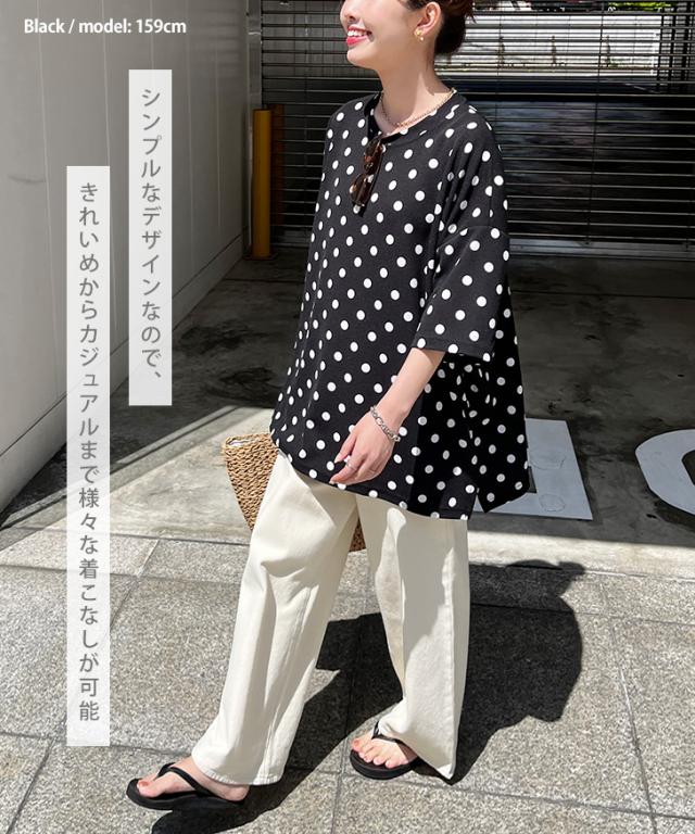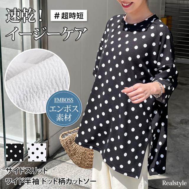 エンボスドット柄サイドスリットワイド半袖カットソー レディース トップス カジュアル おしゃれ Tシャツ 春 夏 速乾 5分袖 チュニック 大きいサイズ ゆったり 体型カバー イージーケア シワになりにくい 大人 レイヤード 重ね着 ラフ 軽い すぐ乾く ロング ルームウェア 部屋着 ストレッチ 伸縮性 きれいめ デイリー 着回し 韓国ファッション 柄Tシャツ ロングTシャツ ロンT アウトドア ティーシャツ ビッグT プルオーバー ラウンドネック クルーネック 丸首 大きい 大きめ ビッグ ワイドシルエット ゆるシルエット 長い 長め ロング丈 長袖 五分袖 7分袖 七分袖 シワにならない しわにならない 韓国 10代 20代 30代 40代 50代 リラックス 柔らか ベーシック 楽ちん やわらか ナチュラル レトロ ルーズ 大人可愛い パジャマ ワンマイルウェア おうち時間 学校 学生 大学生 高校生 お出かけ レジャー トラベル イベント フェス 旅行 キャンプ BBQ 野外 海 川 街着 仕事 OL 通勤 通学 オフィスカジュアル オフィス 洗濯 ウォッシャブル 超時短 動きやすい 黒 白 ブラック ホワイト 白黒 モノクロ モノトーン バイカラー 配色 春夏 秋 定番 ぽっちゃり 妊婦 マタニティ トレンド 流行り 流行 体系カバー 体形カバー お尻が隠れる ヒップカバー お尻カバー お尻隠し お腹カバー お腹隠し 二の腕隠れる 二の腕隠し 二の腕カバー 暑さ対策 きれいめ かわいい 可愛い 水玉模様 柄物 総柄 スリット入り スリット ドロップショルダー 肩落ち ノーアイロン