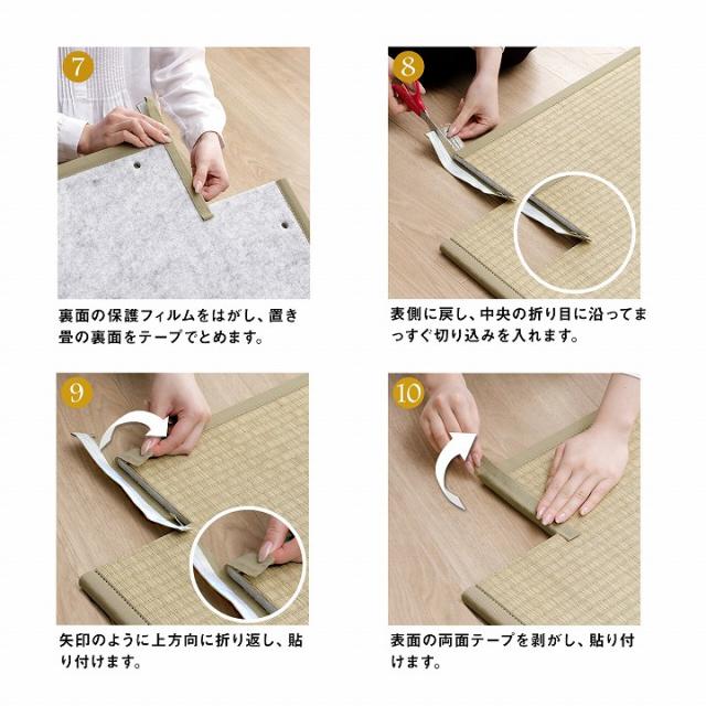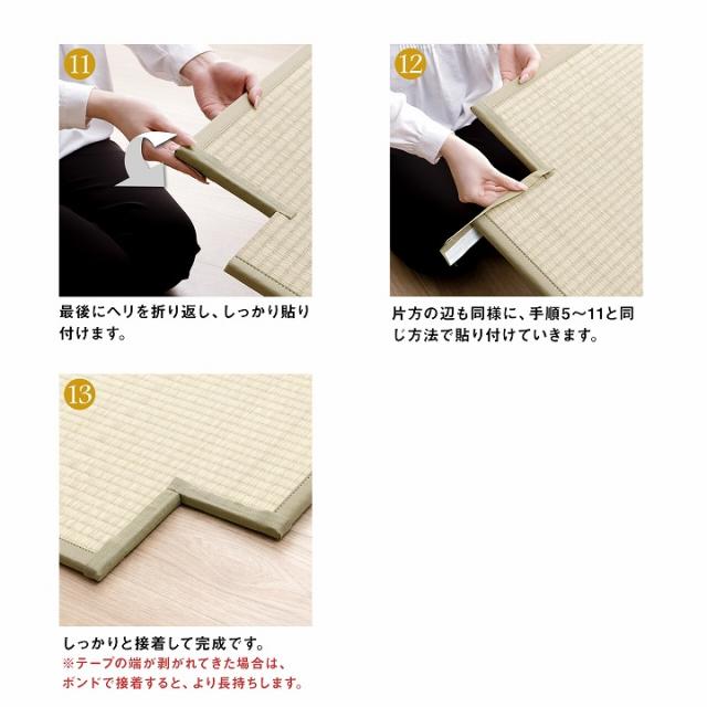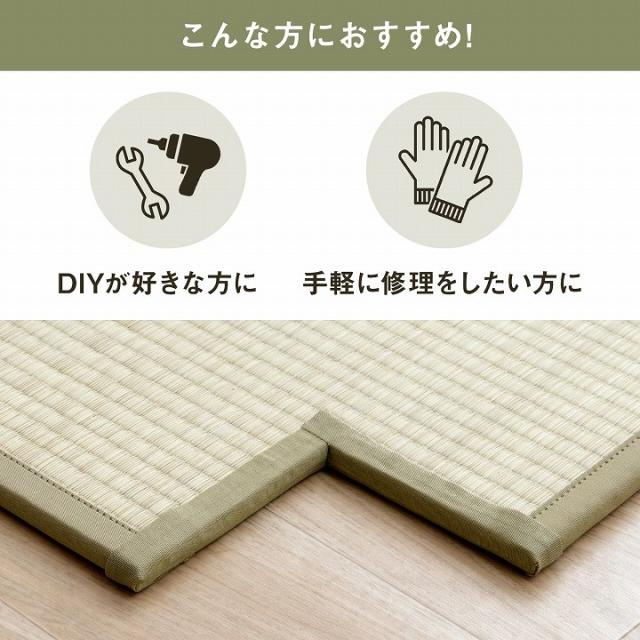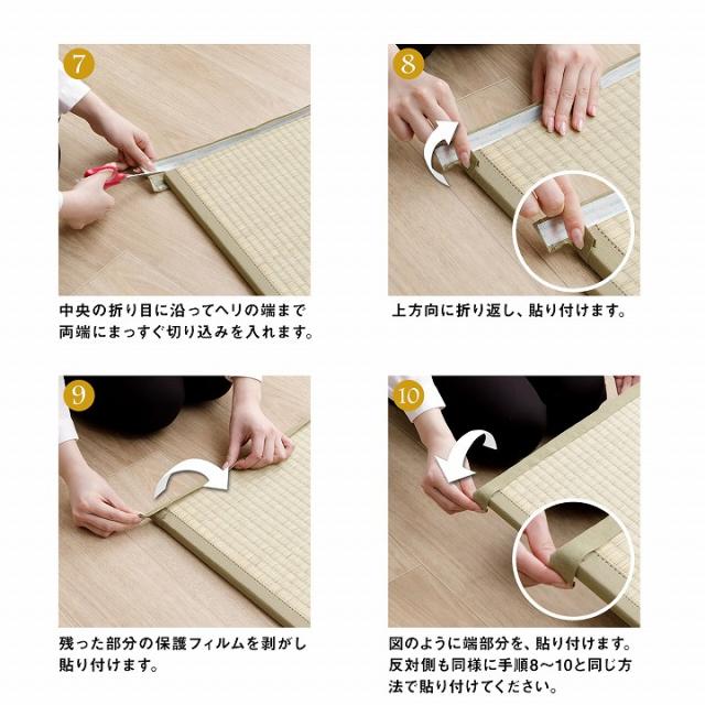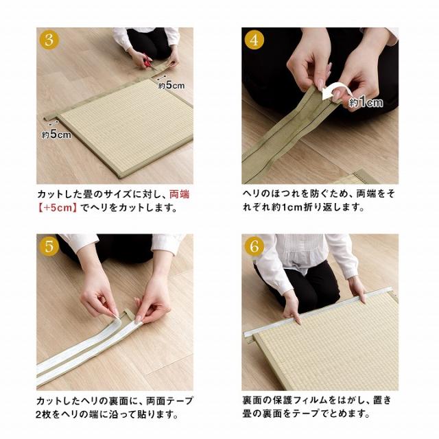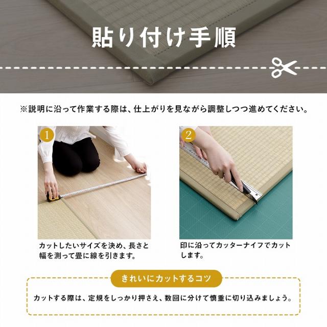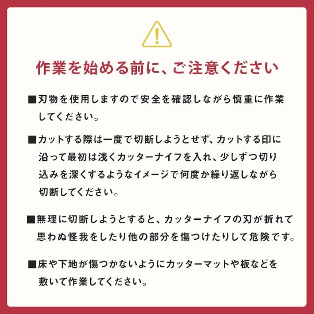 | ■ DIYが好きな方、手軽に修理をしたい方に自分でカットして簡単補正できるキットです。 ■ 畳を必要な長さにカットした後、補正テープで貼り付けるだけ。 ■ 両面テープも付属しているので、お手軽にヘリの補正ができます。 ■ 作業を始める前に、ご注意いただきたいこと ・刃物を使用しますので、安全を確認しながら慎重に作業してください。 ・カットする際は一度で切断しようとせず、カットする印に沿って最初は浅くカッターナイフを入れ、少しずつ切込みを深くするようなイメージで何度か繰り返しながら切断してください。 ・無理に切断しようとすると、カッターナイフの刃が折れて思わぬ怪我をしたり他の部分を傷つけたりして危険です。 ・床や下地が傷つかないようにカッターマットや板などを敷いて作業してください。 |