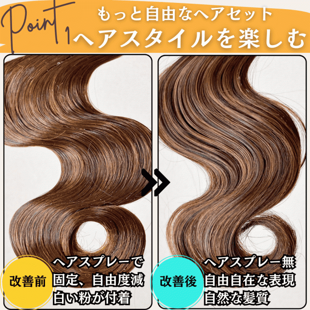 | 特徴3 | ヘアスプレーで固めていない状態で配送。そのためスタイルを自在にアレンジすることが可能 |