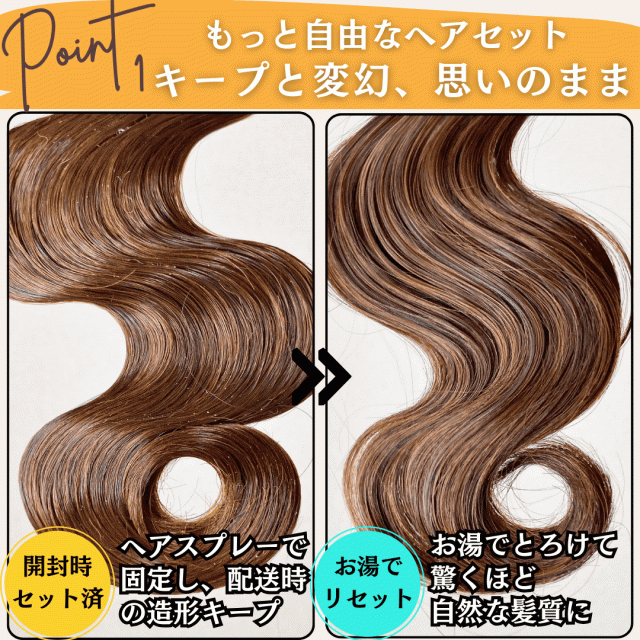 | 特徴3 | 配送時の型崩れを防ぐため、スプレーでプロの型付け済み。お湯でサッと流すだけでスプレーは除去でき、地毛のような自然な髪質へ。届いた瞬間から、自由なアレンジまでこれひとつ。 |