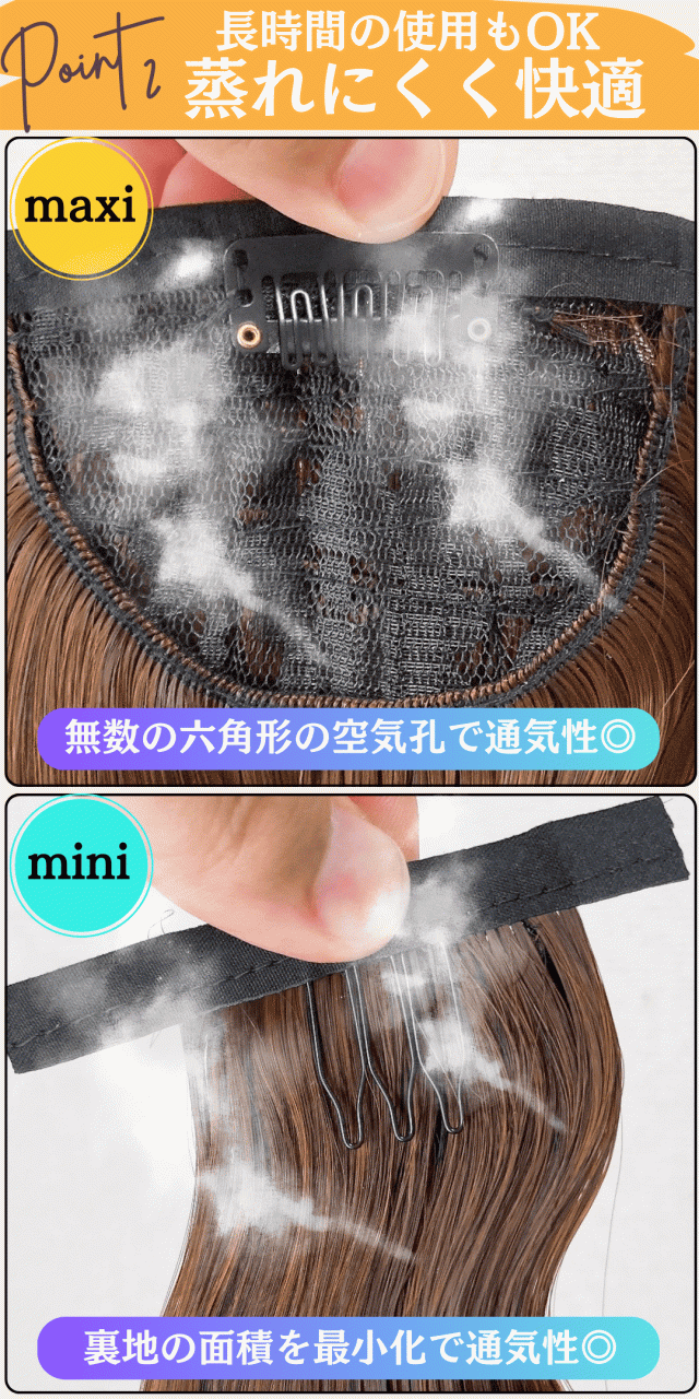 mini: 裏地面積を最小化することで通気性を改善 maxi: 裏地にメッシュ生地を採用し無数の空気孔をつけることで通気性を改善 |