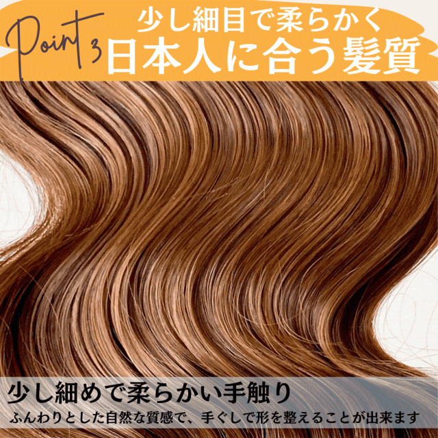 | 特徴2 | 人毛様高級ファイバーの為、ヘアアイロン、ヘアカット、シャンプーも使用可能 |