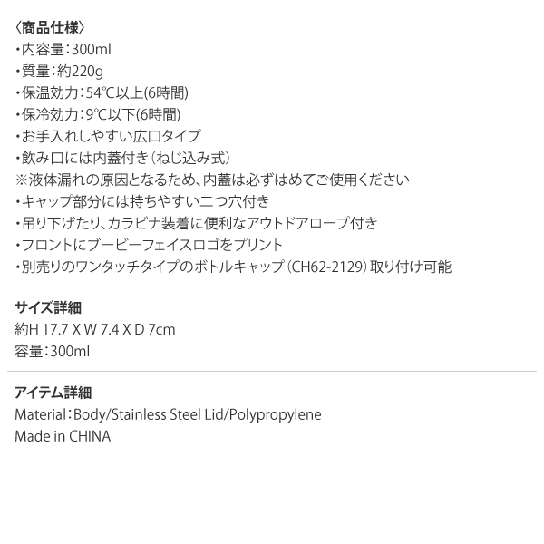 ・内容量:300ml ・質量:約220g ・保温効力:54℃以上(6時間) ・保冷効力:9℃以下(6時間) ・お手入れしやすい広口タイプ ・飲み口には内蓋付き(ねじ込み式) ※液体漏れの原因となるため、内蓋は必ずはめてご使用ください ・キャップ部分には持ちやすい二つ穴付き ・吊り下げたり、カラビナ装着に便利なアウトドアロープ付き ・フロントにブービーフェイスロゴをプリント ・別売りのワンタッチタイプのボトルキャップ(CH62-2129)取り付け可能 〈ご注意ください!〉 ※画像の商品は光の照射や角度により、実物と色味が異なる場合がございます | ||||||