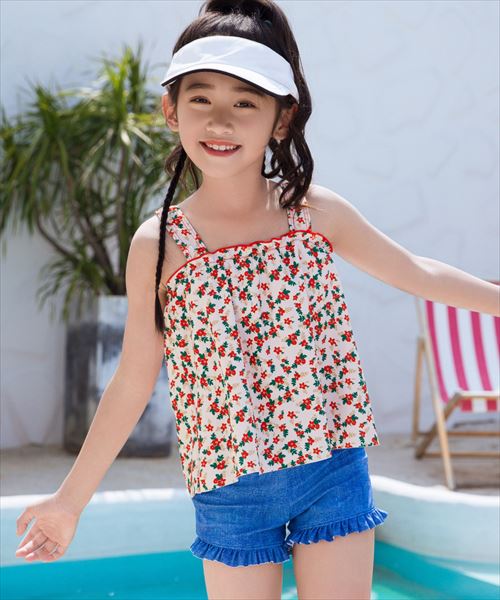 テディショップ(TeddyShop)/キッズ水着 レトロ小花柄フレアデニム風フリルタンキニ 上下2点セット