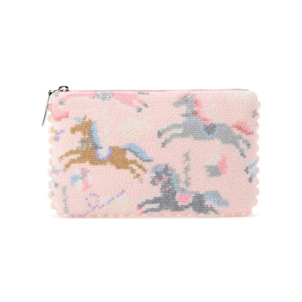 周囲をぐるりとあしらった装飾が愛らしい「ラブラリーモクバ」のポンポンポーチです。色とりどりの木馬柄がドリーミーで魅力的。ペールトーンの色彩も目を引きます。スリムなフォルムで持ち運びしやすいのもうれしいポイント。ちょっとした贈り物にも喜ばれそうな一品です。
