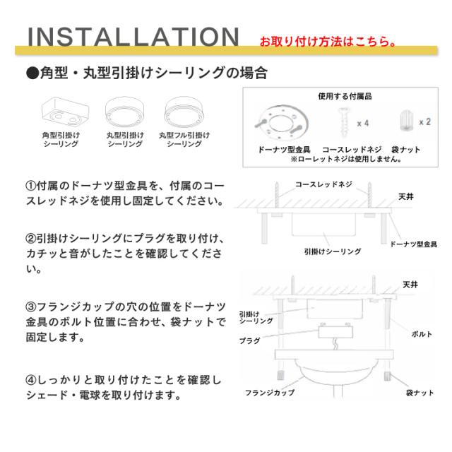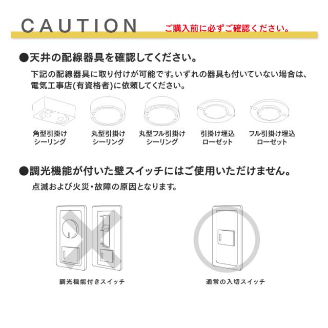 ●本製品は傾斜天井(勾配天井)非対応のシーリングライトです。本体の変形や落下する恐れがありますので設置はお控えください。 ●電球を直接触れると火傷の危険性があります。必ずお子様の手の届かない場所へ設置してください。 ●カーテンや布類など発火の危険性があるもののそばでご使用にならないようご注意ください。 ●24時間連続使用など、1日20時間以上の長時間使用は故障の原因となりますのでお控えください。 ●安全に使用していただくために、器具を定期的に清掃、点検を行ってください。 ●仕様は予告なしに変更する場合がございます。あらかじめご了承ください。 ●引掛けシーリングの形状によって取り付け方法が異なります。設置場所の形状を確認し、取扱説明書をよくお読みになってから取り付け作業を行ってください。 ●ソケットにG9LED電球を取り付ける際は通電していない状態で作業してください。G9LED電球とガラスシェードとの取り付け方法は取扱説明書をよくお読みになってから取り付け作業を行ってください。 ●本製品はG9口金の電球を使用しています。替え電球の販売は行っておりませんが、切れた際は家電量販店や通販サイトなどでご購入いただけます。 ●ガラスシェードには熱を逃すための小さな穴が開いています。また、工場で職人の手作業で製造されているため、製造工程上、黒い点のように見える微細なススが混入していたり、気泡が入っているものもございますが、製品の特性として良品の範囲内とさせていただいておりますので、あらかじめご了承ください。 ●画像はご覧になっているモニター、パソコン、環境などにより実際の商品と色味が異なる場合がございます。あらかじめご了承ください。 【調光器について】 こちらに付属している電球は調光非対応となります。調光器スイッチ(明るさを調光できるタイプのスイッチ)が壁面についている環境でご使用すると、不点灯、チラツキ、故障の原因になりますので使用できません。ON/OFFのスイッチのみの場合は問題なくお使いいただけます。 【真鍮商品について】 表面への塗装加工を行わないことにより、真鍮素材特有の経年変化による色の変色や黒ずみが起こります。その為、お買い上げ時点で多少の色のムラやシミのように見える場合がございます。素手で触れますと変色の原因となりますのでご注意ください。 |