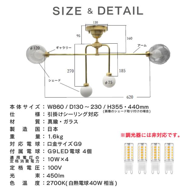 バルム シーリングランプ Ballm Ceiling lamp シーリングライト 4灯 ガラス G9口金 40W相当 450lm ミッドセンチュリー 北欧 真鍮製 天井照明 おしゃれ 日本製 工事不要 インダストリアル モダン 寝室 リビング ダイニング 書斎 店舗 新生活 照明器具 高級感 アンティーク風