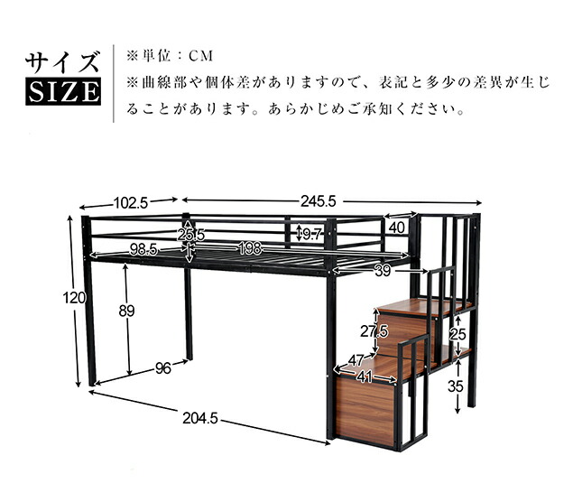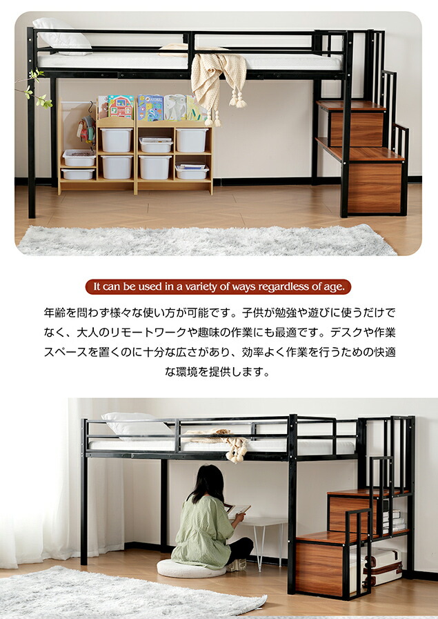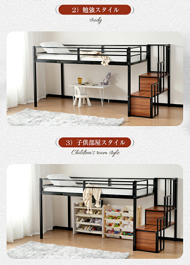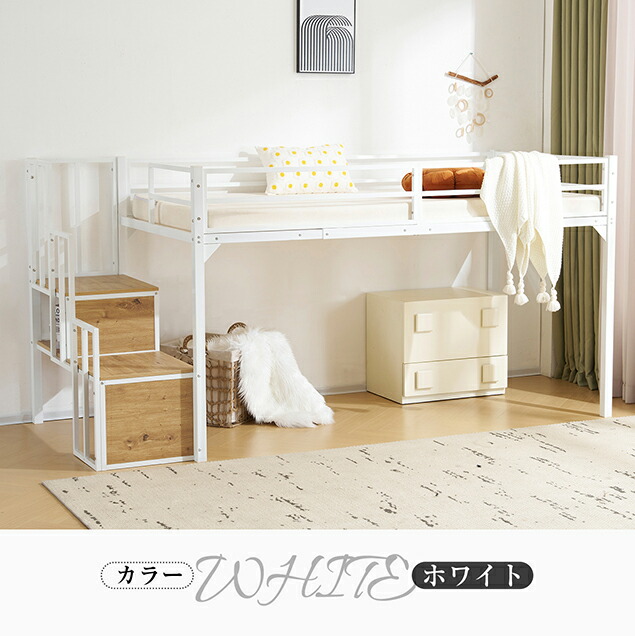【限定10%セール】!人気販売中!NARUMI・ロフトベッド パイプベッド 階段付き シングルベッド ロータイプ ロフトベッドロータイプ 木 収納 北欧風 おしゃれ 子供部屋 スチール BLACKxWHITE