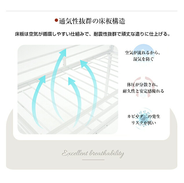 【通気性抜群の床板構造】床板は空気が循環しやすい仕組みで、耐震性抜群で頑丈な造りに仕上げる。空気が流れるから、湿気を防ぐ 体圧が分散され、耐久性と安定感優れる カビやダ二の発生リスクが低い