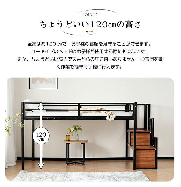 【ちょうどいい12CMの高さ】全高は約120CMで、お子様の寝顔を見守ることができます。ロータイプのベッドはお子様が使用する際にも安心です!また、ちょうどいい高さで天井からの圧迫感もありません!お布団を敷く作業も簡単で手軽に行えます。