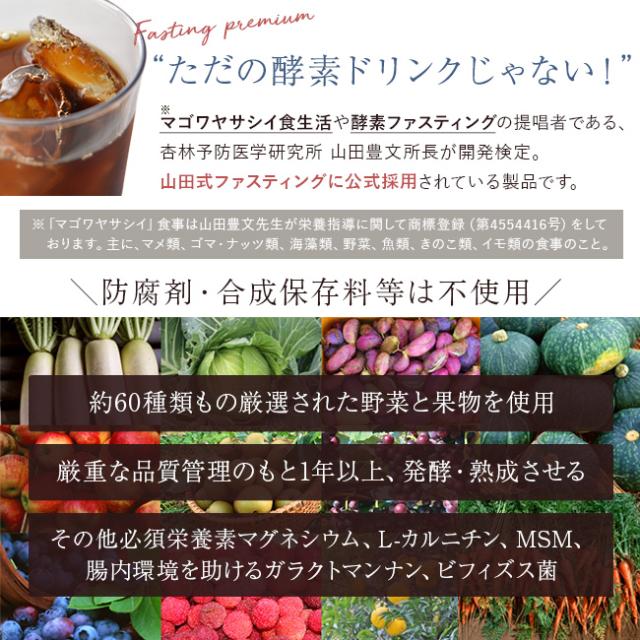 | 原材料名 | 糖類(蔗糖(国内製造)、黒糖、オリゴ糖)、野草類(ドクダミ、オオバコ、ハトムギ、エビスグサ、ヨモギ、スギナ、アカザ、イチョウの葉、カンゾウ、スイカズラ、マタタビの木、クコの葉、ツルナ、アマチャヅル、ウコン、オトギリソウ、カワラケツメイ、カキドオシ、エゾウコギ、ツユクサ、ハブソウ、マツ葉、キダチアロエ、アカメガシワ、ウコギ、クマザサ、タンポポ、ナンテンの葉、コナラ、ナルコユリ、ケイ(桂)、クコの実、ツチアケビ)、野菜類(キャベツ、モヤシ、ブロッコリー、キュウリ、玉ネギ、大根、人参、馬鈴薯、レンコン、山芋、椎茸、ゴボウ、舞茸、ホウレン草、ナタ豆、トマト、パセリ、小松菜、カブ、ニンニク、ニラ)、果物類(パパイヤ、パイナップル、リンゴ、レモン)、ガラクトマンナン分解物、MSM、L-カルニチン、昆布エキス、ビフィズス菌末、L-シトルリン、α-リポ酸、亜鉛含有酵母、ショウガ抽出物、海藻カルシウム/塩化マグネシウム、L-グルタミン、タウリン(抽出物)(一部にやまいも、りんごを含む) |