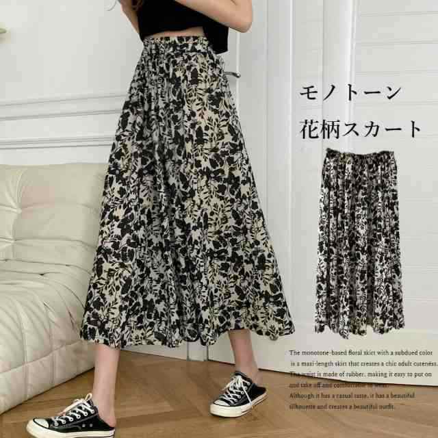 モノトーンベースで落ち着いた色合いの花柄スカートはシックな大人可愛さを演出してくれるロングスカート