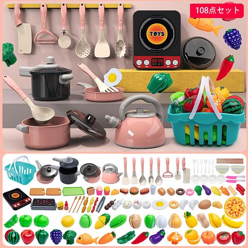 【豪華108食物のように、収納バスケット、果物、野菜、揚げた料理、調理器具、圧力鍋、お鍋、フライパン、ケットル、食パン、飲み物、などいろいろあります。日常生活やダイニングシーンを再現し!お子様に料理の楽しみを体験させて、お母さんは子供が台所に入ることを心配無し!