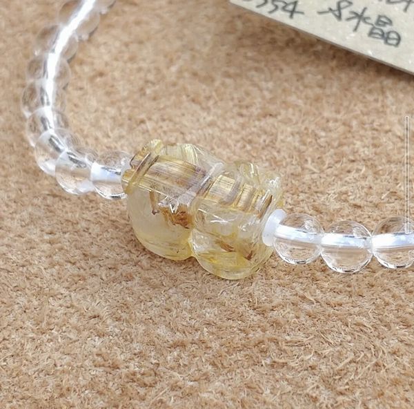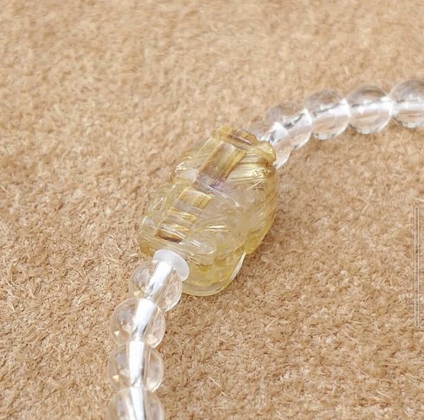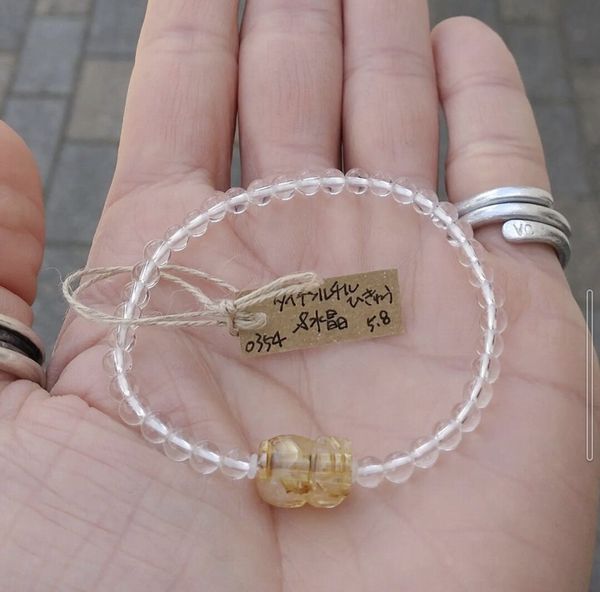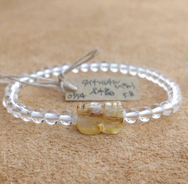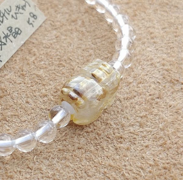 | 水晶:約4mm タイチンルチル、貔貅(ひきゅう):約13mm 水晶粒数:38 内径:約15cm 重さ:5.8g |