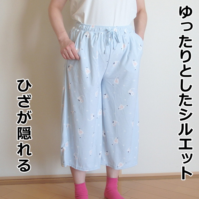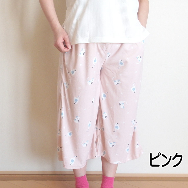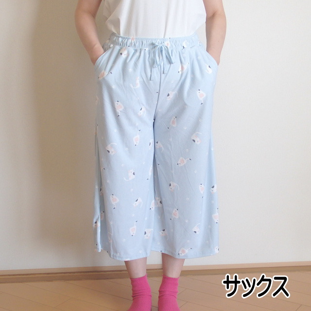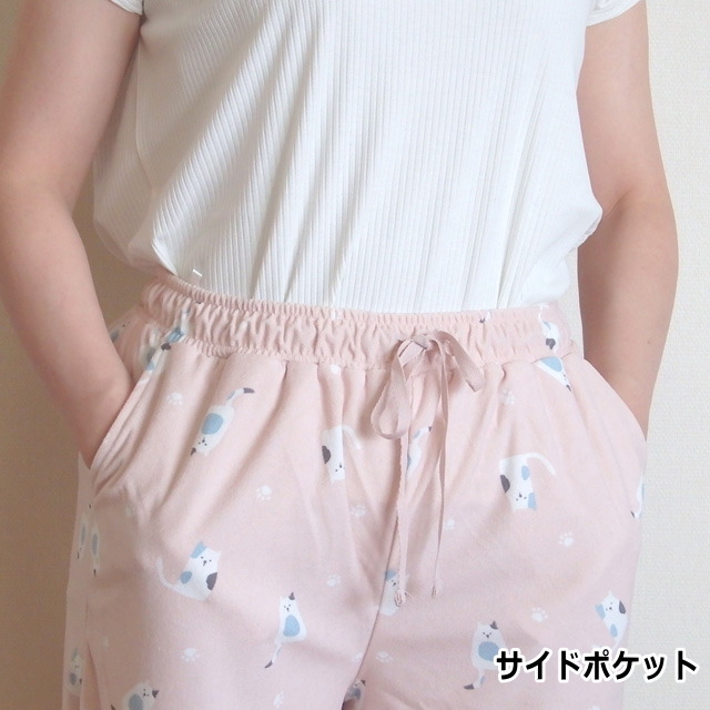 【在庫一掃★1000円ぽっきり】 ルームウエア ワイドパンツ イージーパンツ レディース 七分丈 パイル パジャマ 涼しい やわらか 春 夏 薄手 軽い カジュアル ネコ柄 ピンク ブルー M L フリー ゆったり ウエストゴム ポケット付き 寝巻 部屋着 かわいい【 誕生日 】