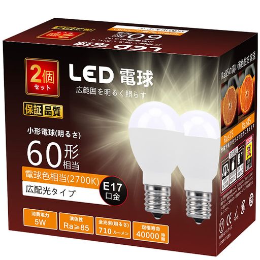 LED電球 60W形相当 電球色 口金直径17MM 広配光 710LM 密閉器具対応 調光不可 2個パック