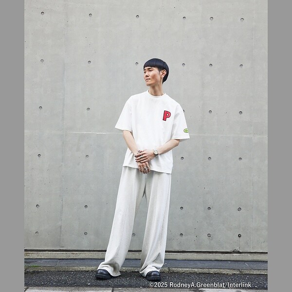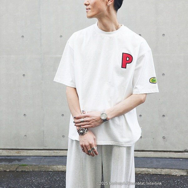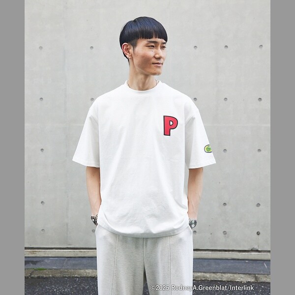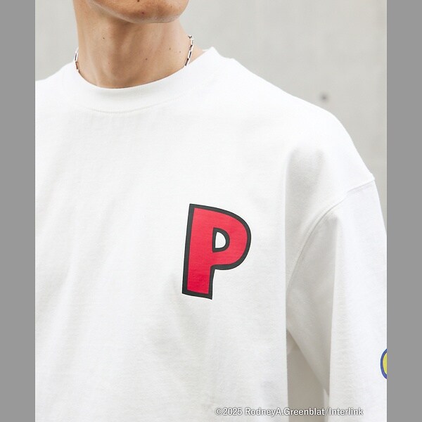 表には『P』のグラフィックを配置、左袖側面にはパラッパのニット帽のカエルモチーフ、背中側にはパラッパとPJベリーにサニーファニーが表情にバリエーションをつけてプリントがされています。