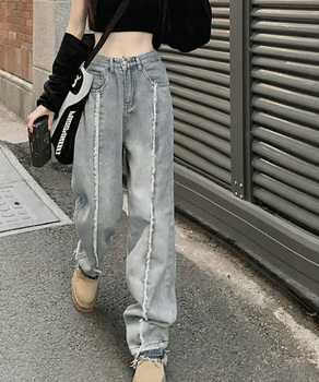 レディース ハイウエストダメージデニム センタープレス風ワイドパンツ 着やせストレートパンツ 美脚脚長Gパン20代30代細見えデニムレトロ 切りっぱなしズボン カジュアルジーンズ