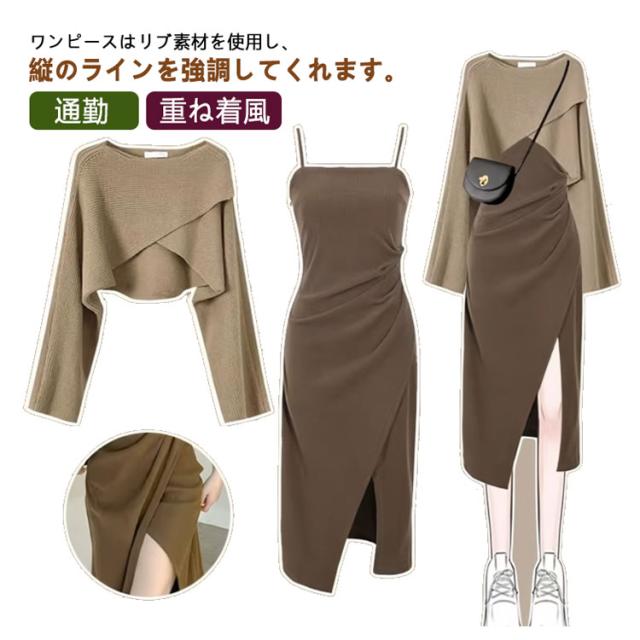| 着回し万能なニットトップスとキャミワンピースのセットアップが登場 ワンピースはリブ素材を使用し、縦のラインを強調してくれます。 歩くだけできれいに広がるフレアシルエットがポイントです。 トップスのフロント位置にあるクロス部分に目が行きスタイルアップ効果も◎ セットで着用するのはもちろん、単品使いもお楽しみいただけるアイテムです。 トップスは短め丈なので、どんなボトムスにも合わせやすくコーディネートの幅が広がります。 ふんわり軽やかで、やわらかくやさしく肌触りがニットの魅力。 インナーや羽織りを変えることで、今からロングシーズン着用できます。 | |