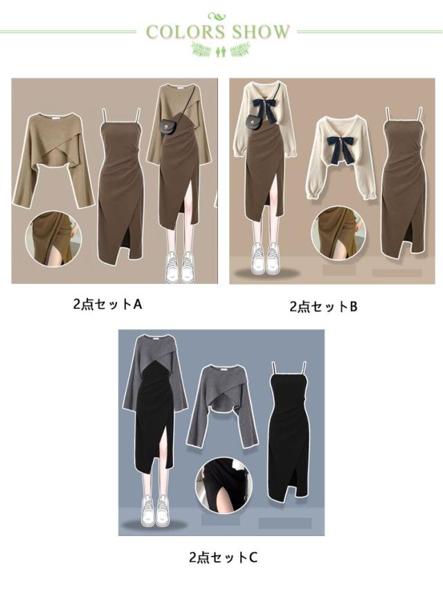 ニット キャミソール ワンピース ニットセーター セットアップ レディース 2点セット 長袖 クロス ボートネック ニットトップス ロングワ