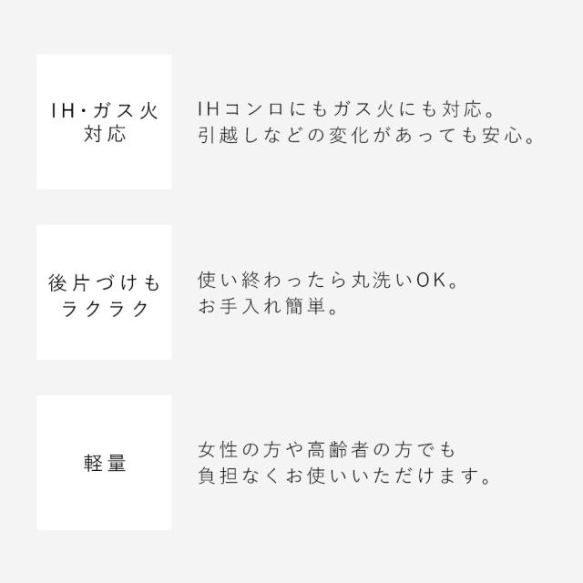 IHコンロにもガス火にも対応しているので、引越しや調理環境の変化があっても安心です。