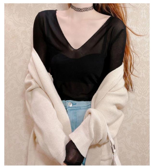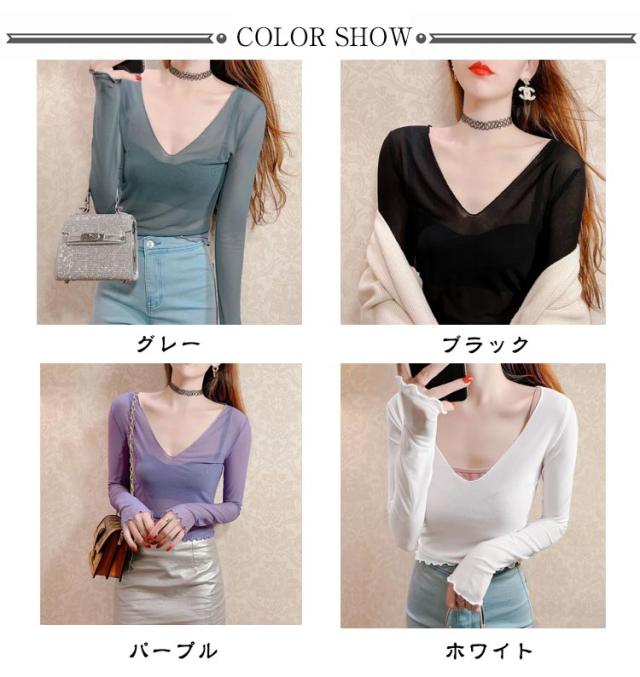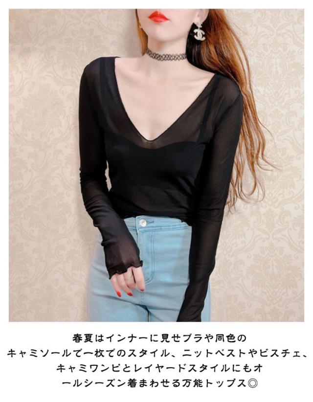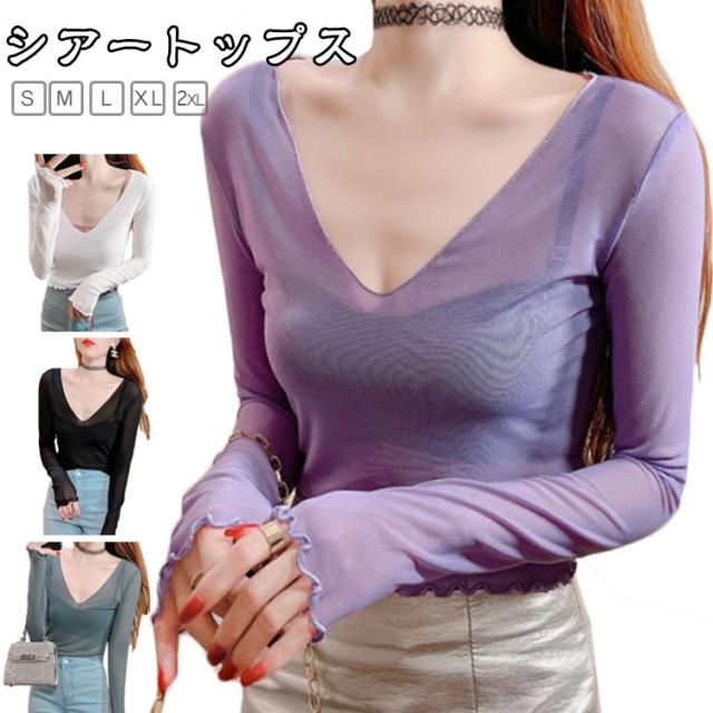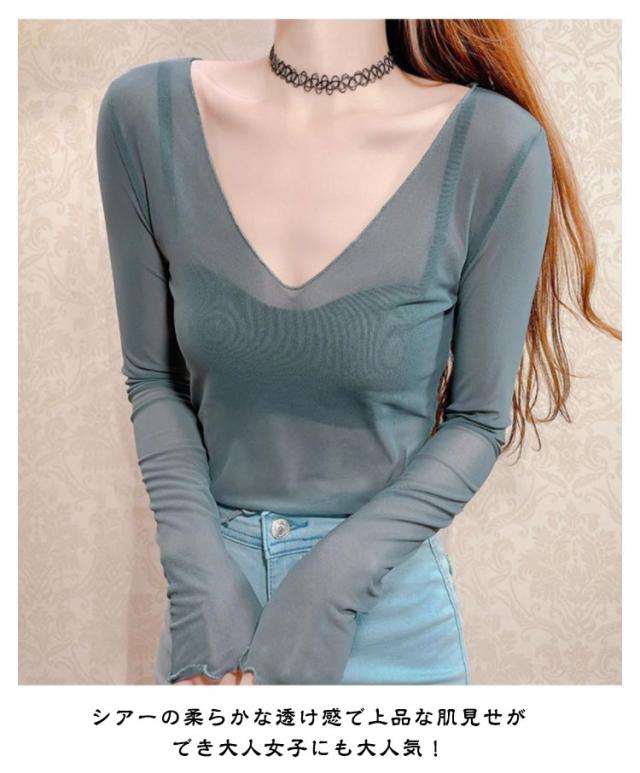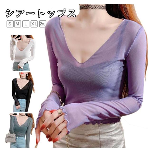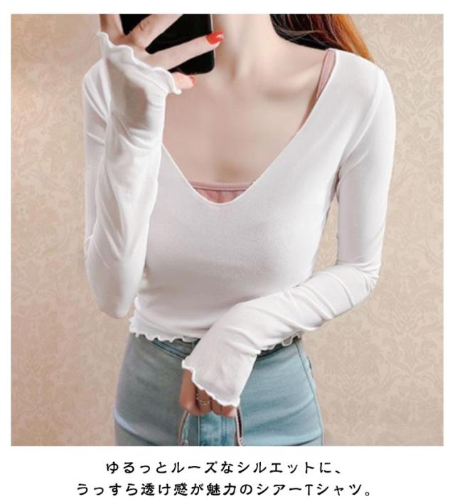 シアートップス 涼しい 長袖 シアー 五分袖 透け感 紫外線対策 重ね着 薄手 カットソー インナー シアー シアートップス おしゃれ ロンT Vネック 涼しい シースルー カットソー メロウ フリル 秋冬 首 春夏 トップス 春 夏 秋 冬 体型カバー