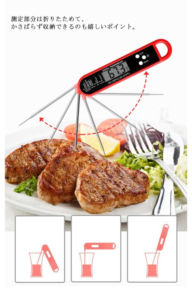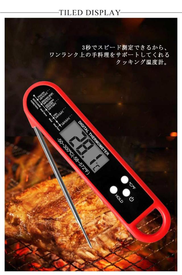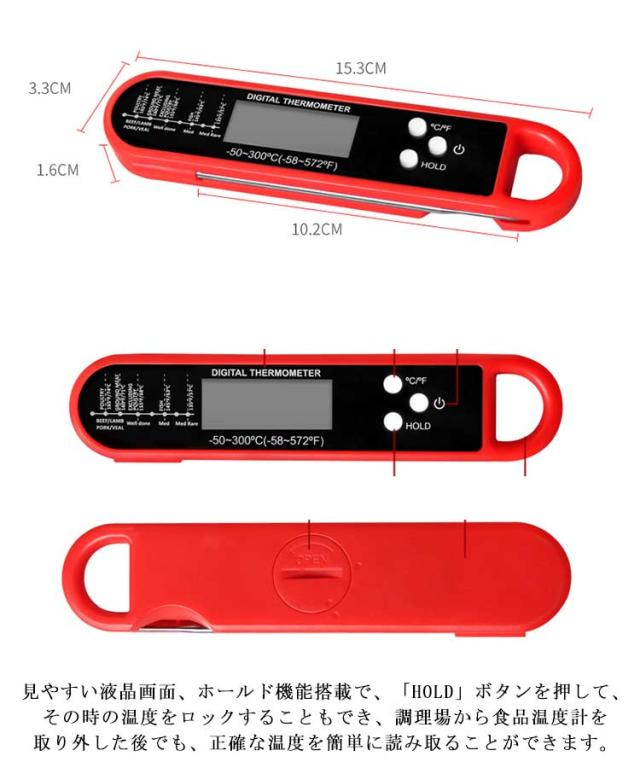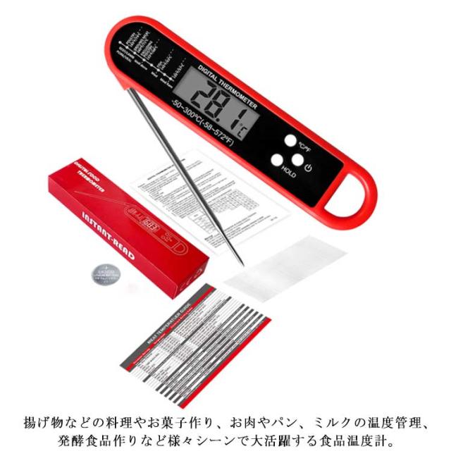 | 3秒高速&正確な測定・マグネット内蔵で冷蔵庫にピタッと収納可。 3秒でスピード測定できるから、ワンランク上の手料理をサポートしてくれるクッキング温度計。 見やすい液晶画面、ホールド機能搭載で、「HOLD」ボタンを押して、その時の温度をロックすることもでき、調理場から食品温度計を取り外した後でも、正確な温度を簡単に読み取ることができます。 揚げ物などの料理やお菓子作り、お肉やパン、ミルクの温度管理、発酵食品作りなど様々シーンで大活躍する食品温度計。 測定部分は折りたためて、かさばらず収納できるのも嬉しいポイント。 -50℃〜300℃までと幅広い測定範囲の上、摂氏(℃)と華氏の温度単位を選択可能です。 赤ちゃんにミルクや離乳食を食べさせるときも、正確な温度を知ることができるので、子育て中の方にも便利なアイテムです。 磁石付きで冷蔵庫にピタッとくっついて保管したり、フックに吊り下げ収納したりできるから、収納場所に困りません。 | |