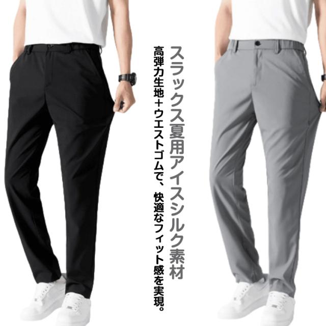 | スラックス|夏用アイスシルク素材 【接触冷感×ストレッチ!真夏も快適】 通気速乾素材で、汗をかいてもすぐ乾き、ムレ知らず。 高弾力生地+ウエストゴムで、快適なフィット感を実現。 柔らかくドライな肌触りで、長時間穿いても快適。 型崩れしにくい、毛玉になりにくい、縮みにくい高品質仕様。 ビジネスカジュアル、出張、旅行、スポーツ、デイリー使いにもおすすめ。 | |