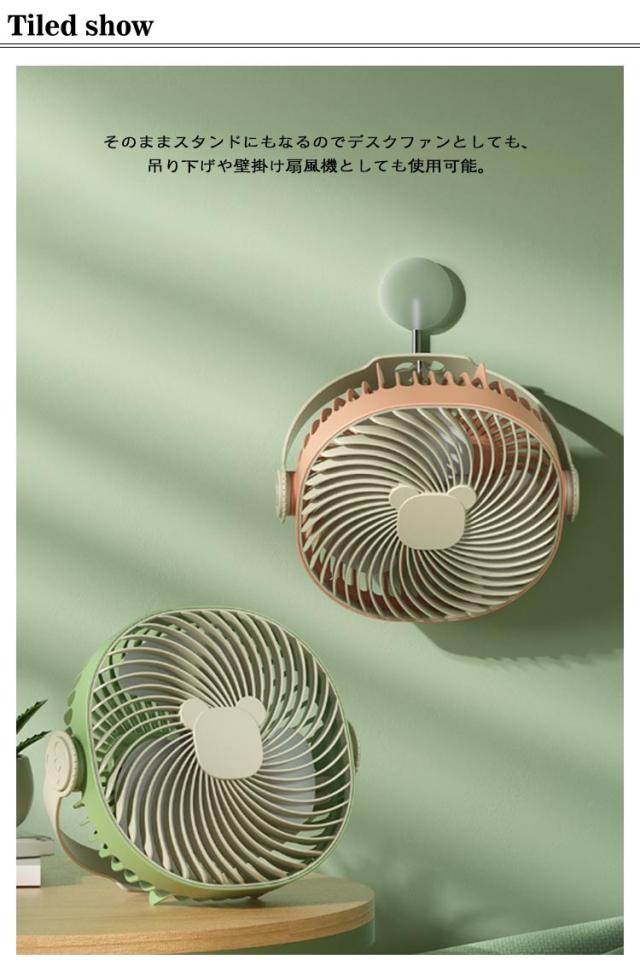 | 涼しさと灯りがひとつになった、3WAY仕様のミニ扇風機。【壁掛け&吊り下げ可能】 そのままスタンドにもなるのでデスクファンとしても、吊り下げや壁掛け扇風機としても使用可能。 ファンとライトが同時に使えるので、夜に光を提供します。 この卓上扇風機には1200mAhのバッテリー容量があり、最大6時間の連続使用が可能です。 高品質なブラシレスモーターを搭載した卓上扇風機は運転中の騒音は僅か40DBです。図書館や仕事などの静かな場合でご使用でも周囲の迷惑になりません。 360度調整が可能で、好きな角度から気持ち良い涼しい風が吹き、涼しい夏のそよ風をお楽しみます。また、二つつの使い方があります。1スタンド:デスクファンデスクやコーヒーテーブルなどに置いて、角度を上下自由に調整できます。2壁掛け:スタンド部分をフックなどに掛ければ、壁掛けファンとして使えます。 | |