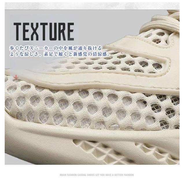 | どんな服でもお洒落にコーディネートしてくれるスニーカーです! 歩くたびスニーカーの中を風が通り抜けるような涼しさ、素足で履くと新感覚の清涼感。 弾力性のよいゴムソールと凸凹設計で、衝撃をしっかり吸収し、足や膝を守りつつ、疲れにくく、歩きやすい。 グリップ力抜群の凸凹アウトソール、山登りなどアウトドアシーンにも重宝します。 夏のウォーキングやランニング、ジムなどスポーツに大活躍に間違いなし 履きやすく カジュアルでいて春夏にオススメ! 使える便利な一足です | |