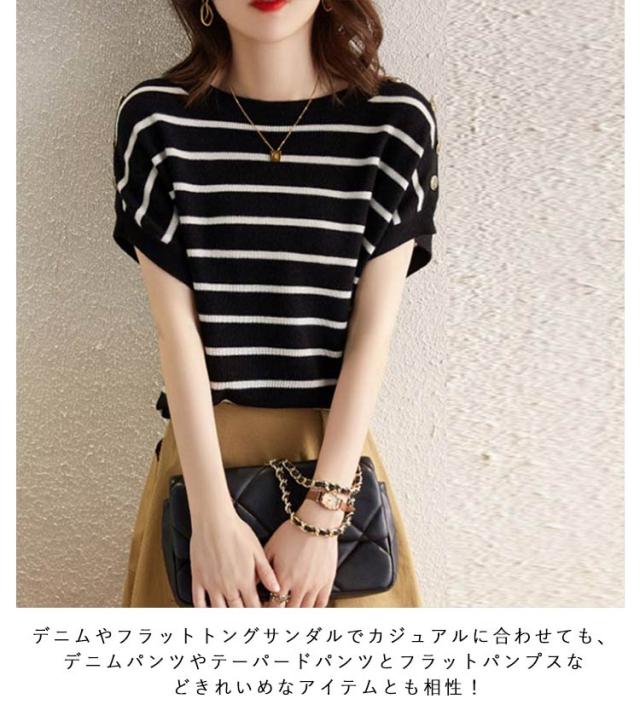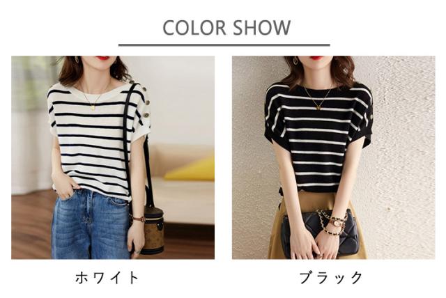 Tシャツ 半袖Tシャツ レディース 夏 フレンチスリーブ ボタン付き ストライプ カットソー レディースファッション インナー トップス クルーネック 薄手 柔らかい ゆったり 体型カバー 黒 白 ブラック ホワイト 大きいサイズ 送料無料