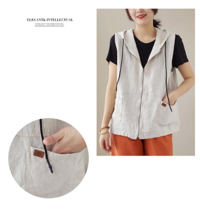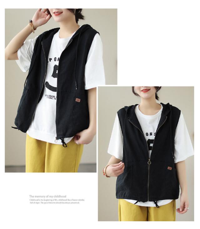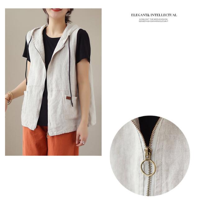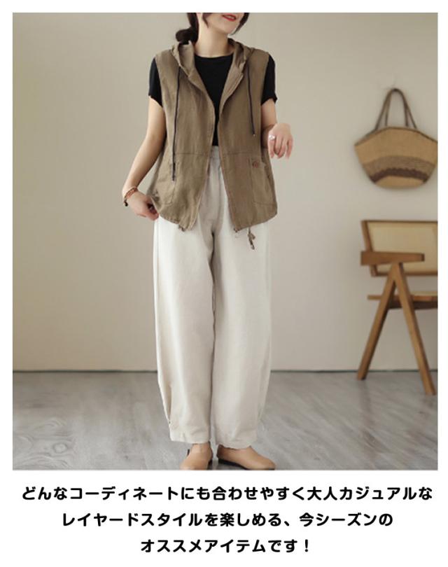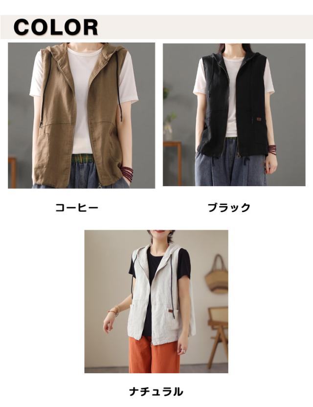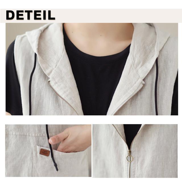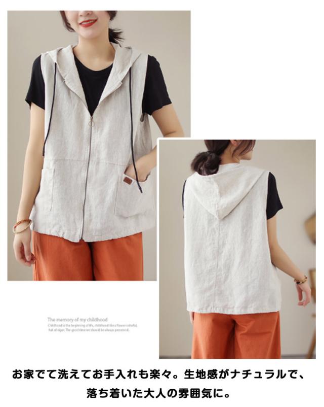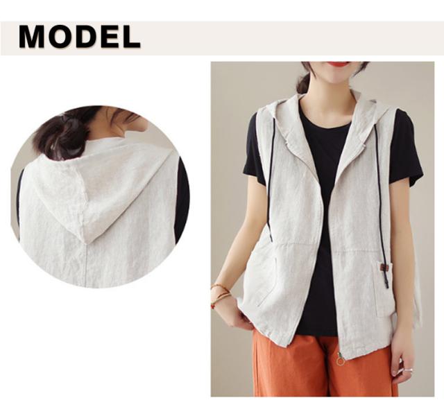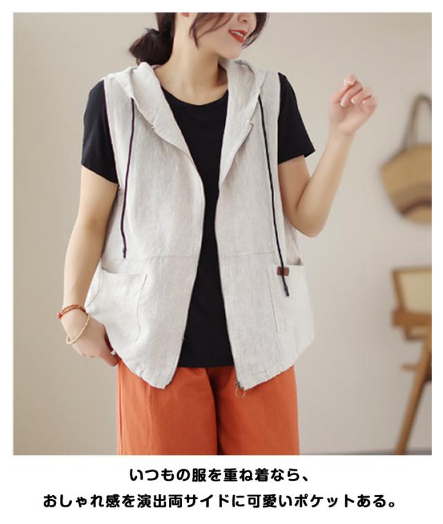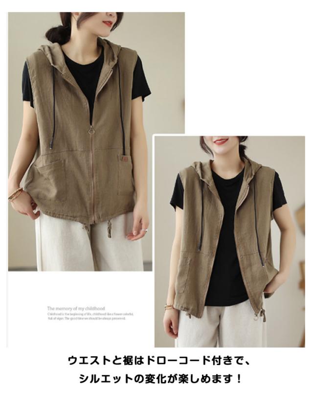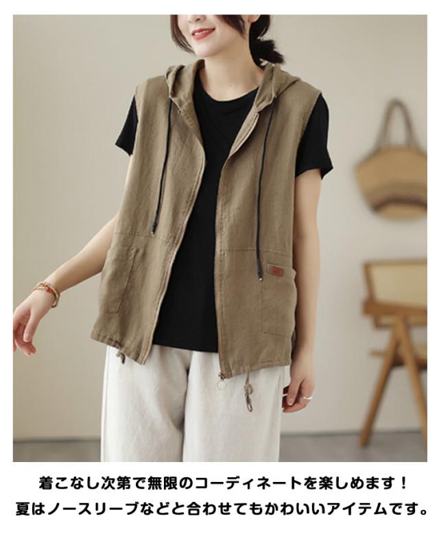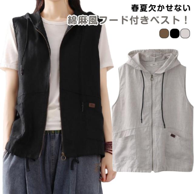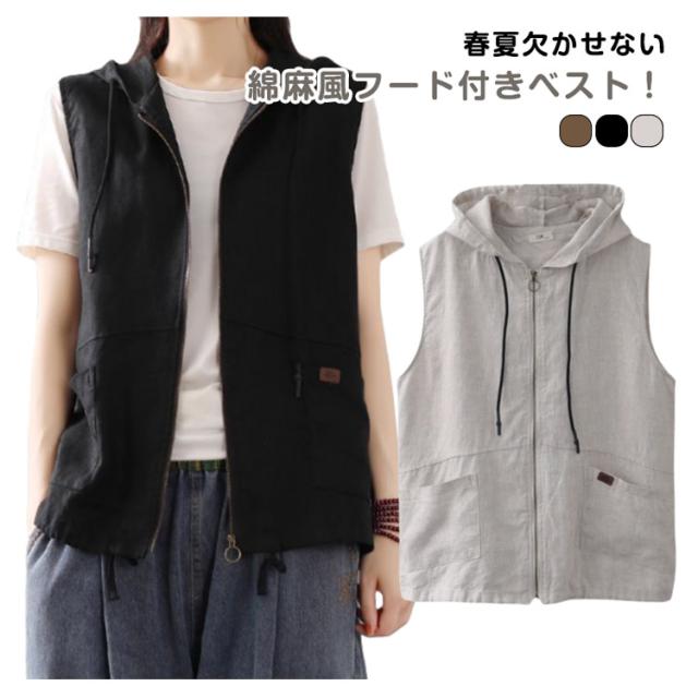 ベスト ジレ レディース 綿麻風 リネン風ベスト 前開き トップス ノースリーブ アウター トレンチベスト コート フード付き パーカー風ベスト レイヤード 重ね着 無地 羽織り ライトアウター ショート丈 春 夏 秋 大人 着回し おしゃれ ジップアップパーカー 送料無料