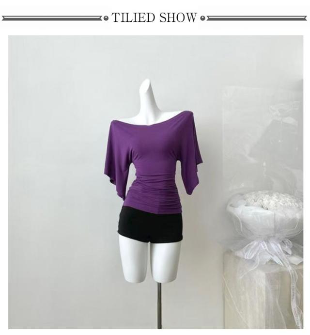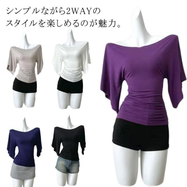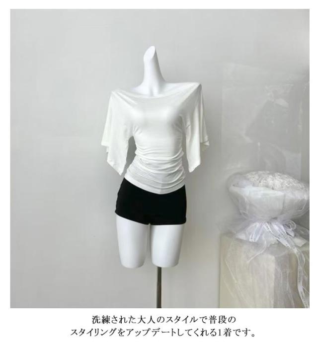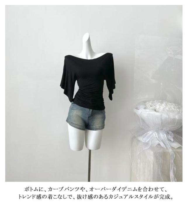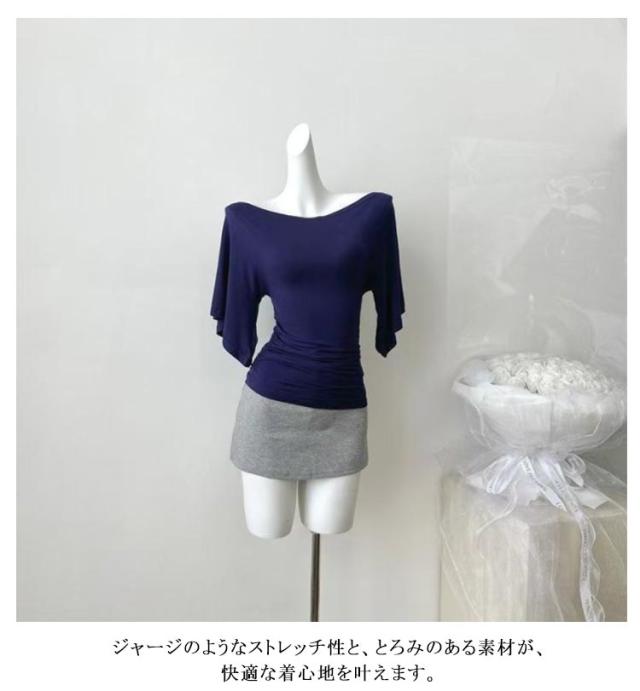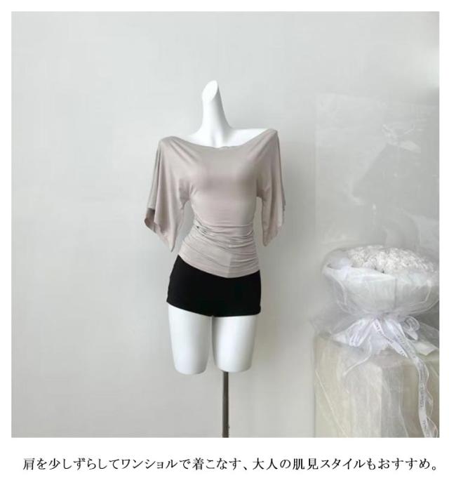 送料無料 五分袖Tシャツ 薄手 レディース オフショルダー Tシャツ トップス 伸縮性 鎖骨見せ 送料無料 無地 ストレッチ シンプル ベルスリーブ プルオーバー キレイめ カジュアル 体型カバー カットソー 着痩せ カジュアル 春 夏