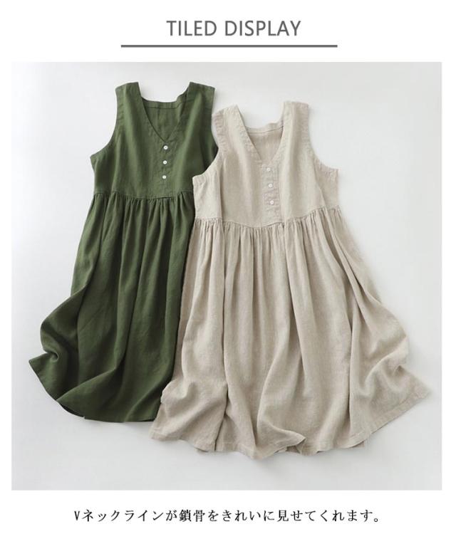 | 1枚で簡単楽チン、リラクシーな袖なしvネックワンピース Vネックラインが鎖骨をきれいに見せてくれます。 ウエストは高めの位置でタック切り替えを入れ、着るでスタイルアップ効果を発揮します。 ゆったりしたデザインになっているので、どんな体型にも合う。 | |