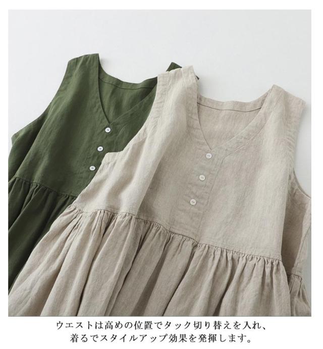 夏用 レディース きれいめ 体型カバー ゆったり 綿麻ワンピース ベージュ ワンピース 無地 グリーン Aライン 部屋着 ワンピース 袖なし 夏 大きいサイズ カジュアル ゆったり 着?せ 女性 夏物 旅行 オシャレ