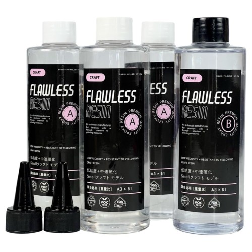 最適な用途 :レジン立体小物作品、標本、ウッドレジン、レジンアクセサリー、オルゴナイトなど 気泡抜けと撹拌性がとても良い超低粘度で、計量しやすくボトルを汚さない滴下キャップと片手で扱えるハンドサイズのボトルを採用した扱いやすさに徹底的にこだわったモデルです。※混合比率(重量比):主剤A3 対 1B硬化剤 室温25℃以上・厚み2cm以上であれば1日で硬化、ある程度の厚みの立体物も1層注型が出来ます。 硬化速度と注型能力のバランスが良く、小〜中サイズの立体作品の製作に最適です。18℃/2cm厚以下の積層ならレジンテーブルにもお使い頂けます。※脱枠可能時間 :室温約25℃ 約24〜48時間(厚み1cm約36h/2cm約24h) フローレスレジンのラインナップの中でも最も透明度が高く、フローレスレジン独自の最新の黄変対策も導入されているので、黄変させたくない・透明度に拘りたい作品などにも安心してお使い頂けます。 最上級の安心・安全 / VOCフリー :厚生労働省が定める食品に直接触れる容器としての食品衛生法の規格基準、およびポジティブリストに適合しています。 硬化後は無害・無毒・無臭の食器が作れるエポキシレジンです。