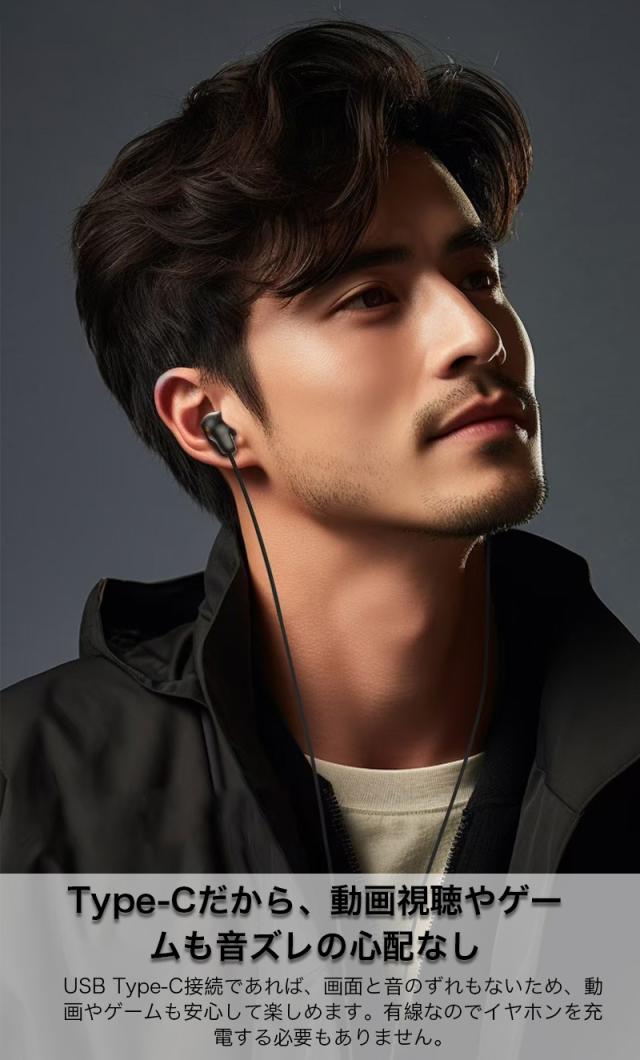 USB Type-C接続であれば、画面と音のずれもないため、動画やゲームも安心して楽しめます。有線なのでイヤホンを充電する必要もありません。