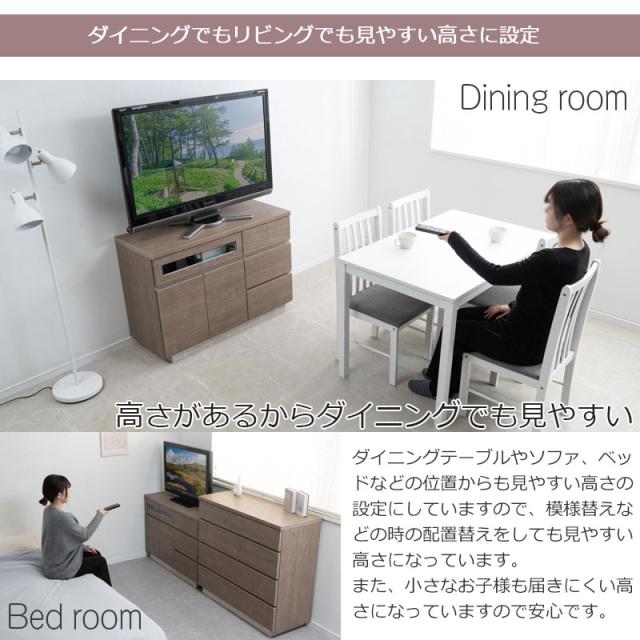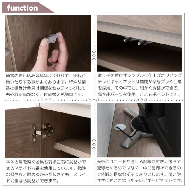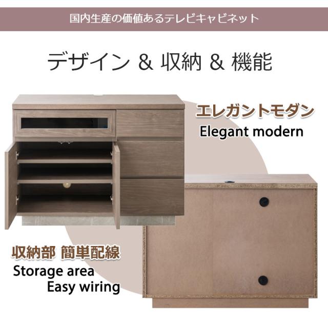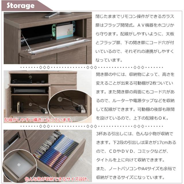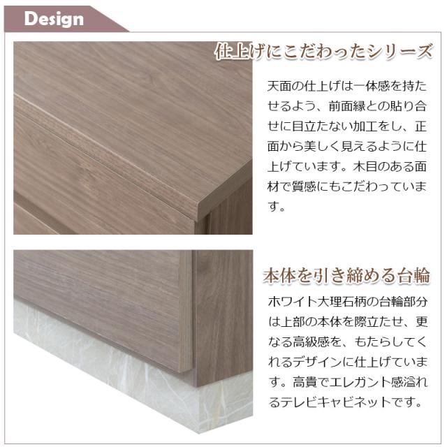 | 説明 | マットでモダン感のあるグレージュ『THE ELE』ジールシリーズからリビングダイニングアイテムが新登場。大理石調柄の台輪と艶を落としたグレージュ系の落ち着いた木目カラーを使用したエレガントモダンテイストのテレビキャビネット。高さ71.5cmとリビングからもダイニングからも見やすい高さに設計されています。閉じたままでリモコン操作ができるガラス扉はフラップ開閉式。AV機器をホコリから守ります。配線がしやすいように、天板・フラップ扉内・開き扉内にコード穴が付いて配線処理がしやすい。コード穴はキャップ付きなので気になる埃もシャットアウト。開き扉内には、収納物によって、高さを変えることが出来る可動棚が2枚ついています。可動棚の後部には隙間を設けているので、上下の配線処理もOK。背面にコード穴もあるので、見栄えの悪いルーターや電源タップなどを隠して収納ができます。3杯ある引出しには、色んな小物が収納できます。下2段の引出しは深さが17cmあるので、CDやDVD、コミックなどが、タイトルを上に向けて収納できます。また、ノートパソコンやA4サイズも余裕で収納ができるサイズになっています。ダイニングテーブルやソファ、ベッドなどの位置からも見やすい高さの設定にしていますので、模様替えなどの時の配置替えをしても見やすい高さになっています。また、小さなお子様も手の届きにくい高さになっていますので安心です。長く使っても飽きのこないデザインで、リビングの中心的な存在に。エレガントモダンな印象で気品高いリビングキャビネットシリーズ ジールを是非、リビングの中心に♪ |